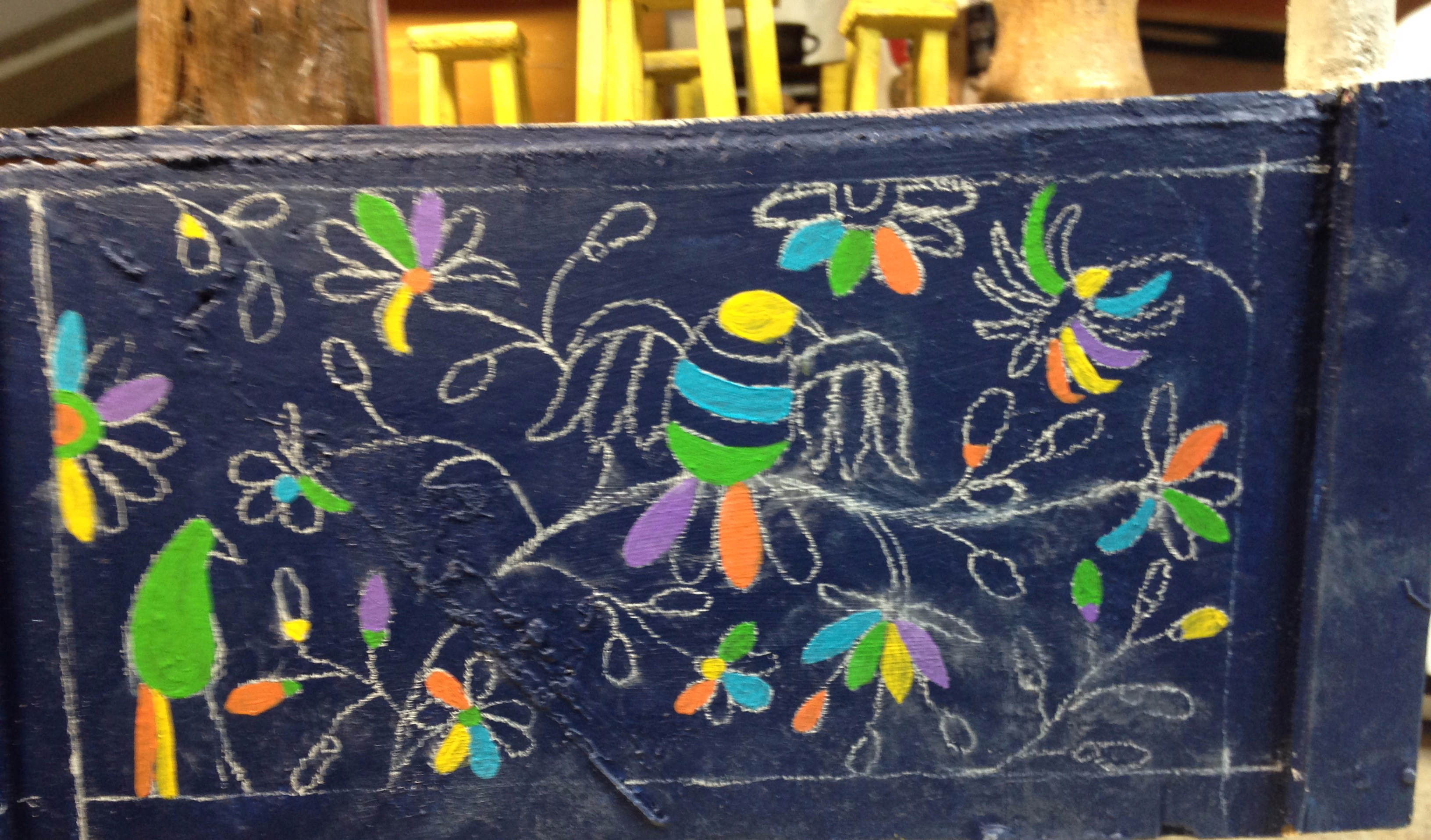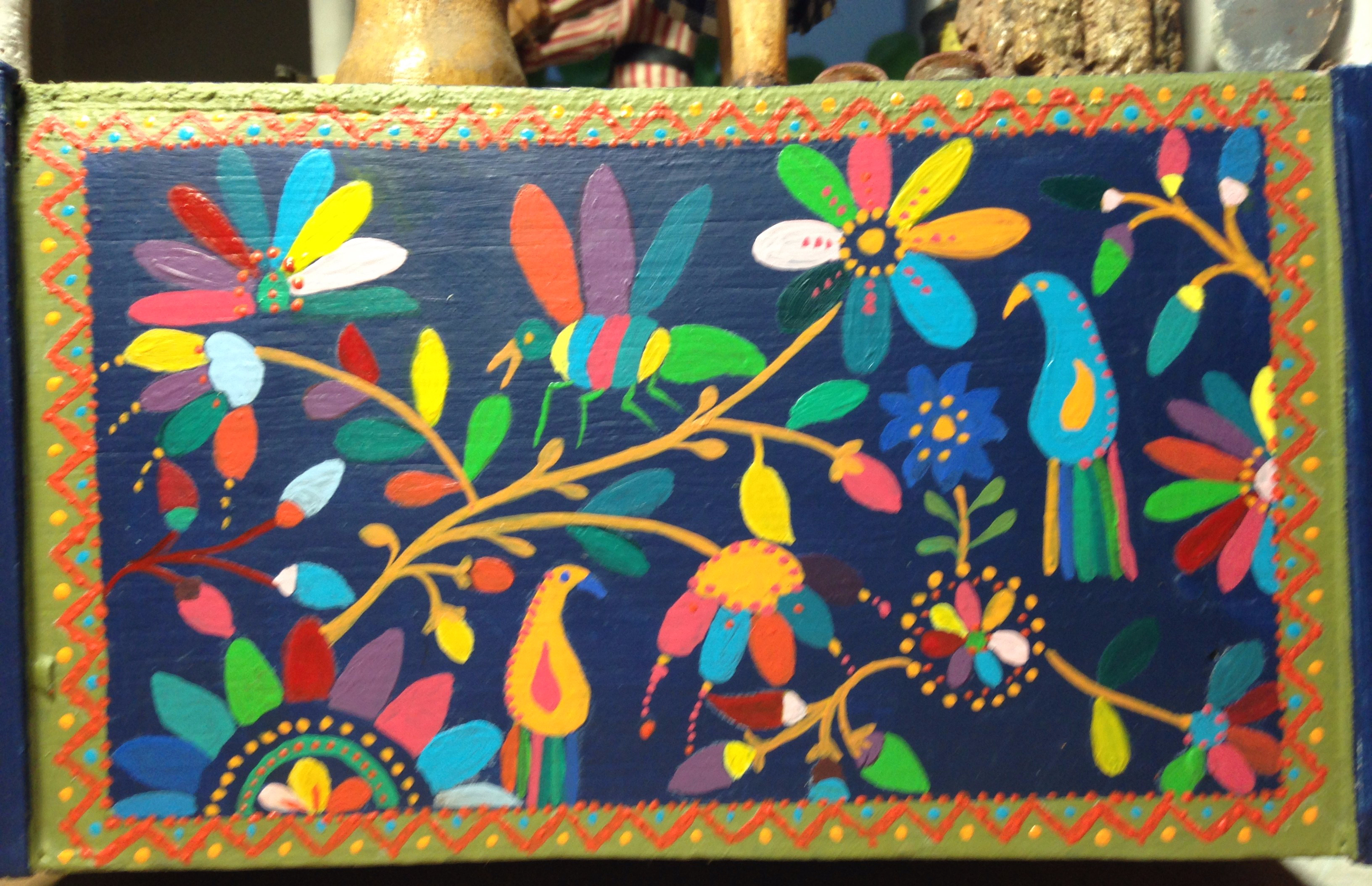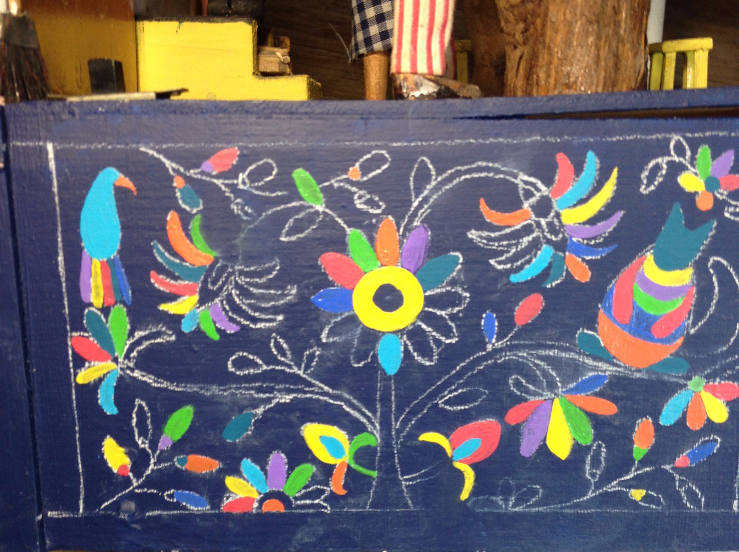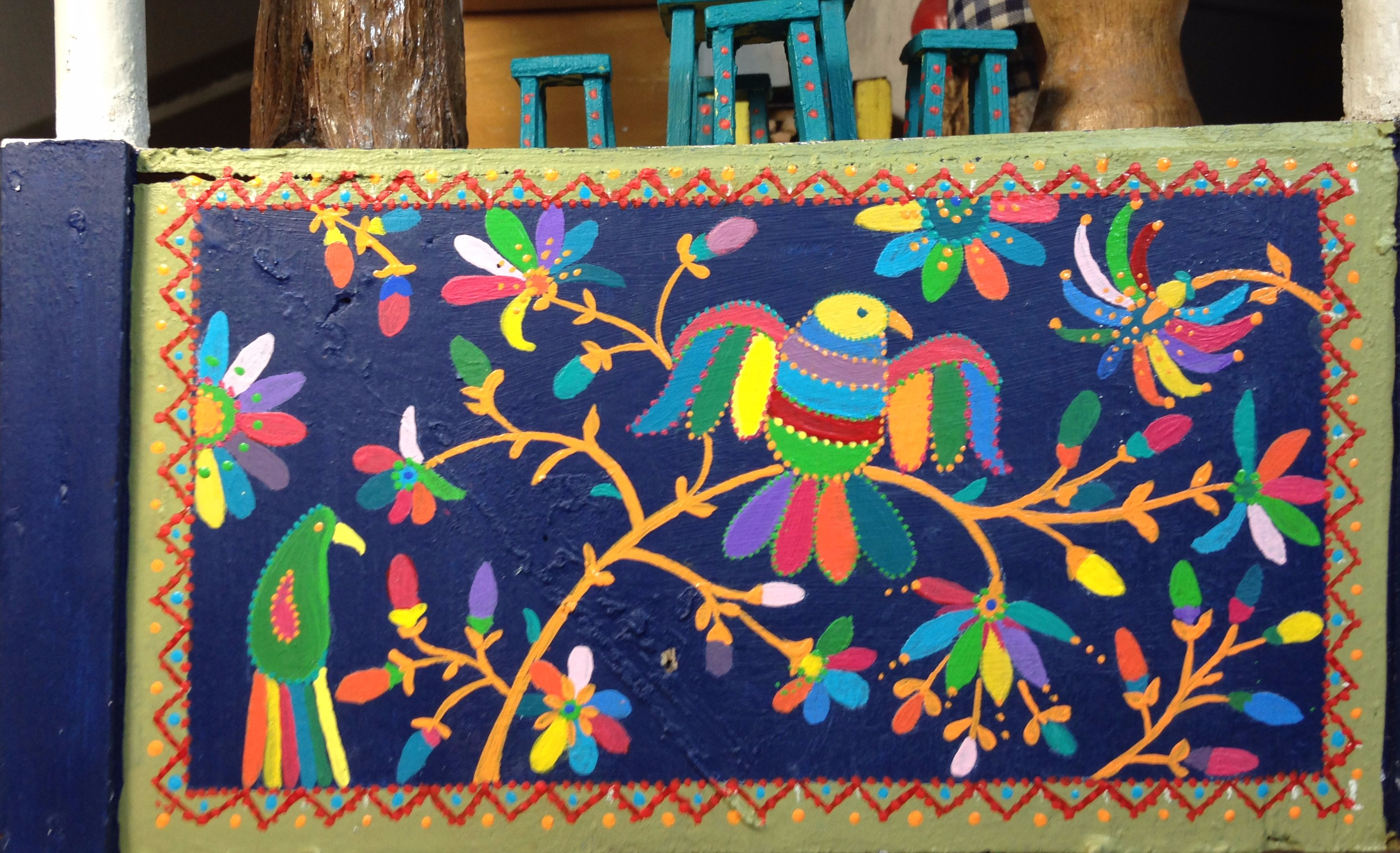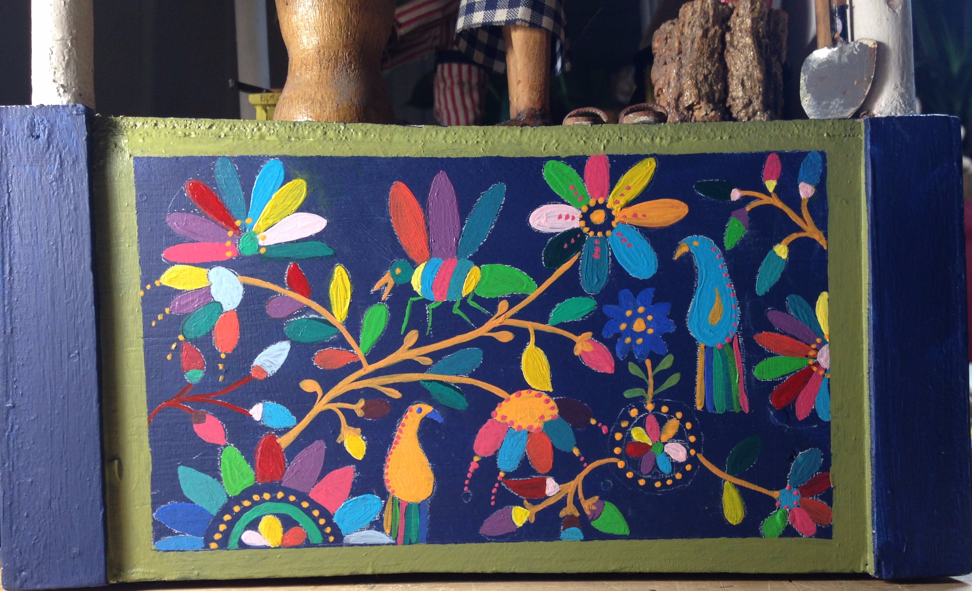 J’ai commencé par imaginer un socle aux couleurs de l’Amérique du Sud. Toutes les peintures sont réalisées avec de la peinture acrylique. Celle que l’on trouve dans les rayons de magasins de loisirs créatifs mais aussi dans les magasins de bricolage sous la forme d’échantillons de peinture pour murs.