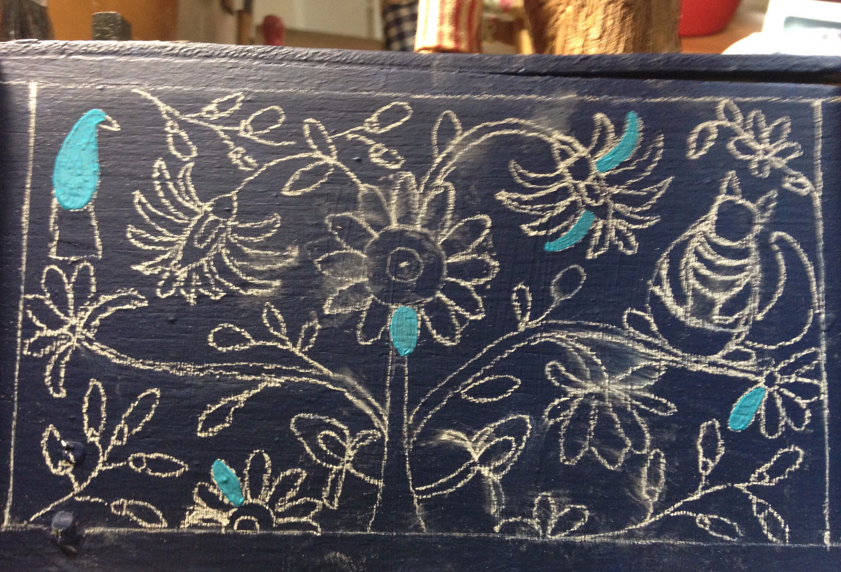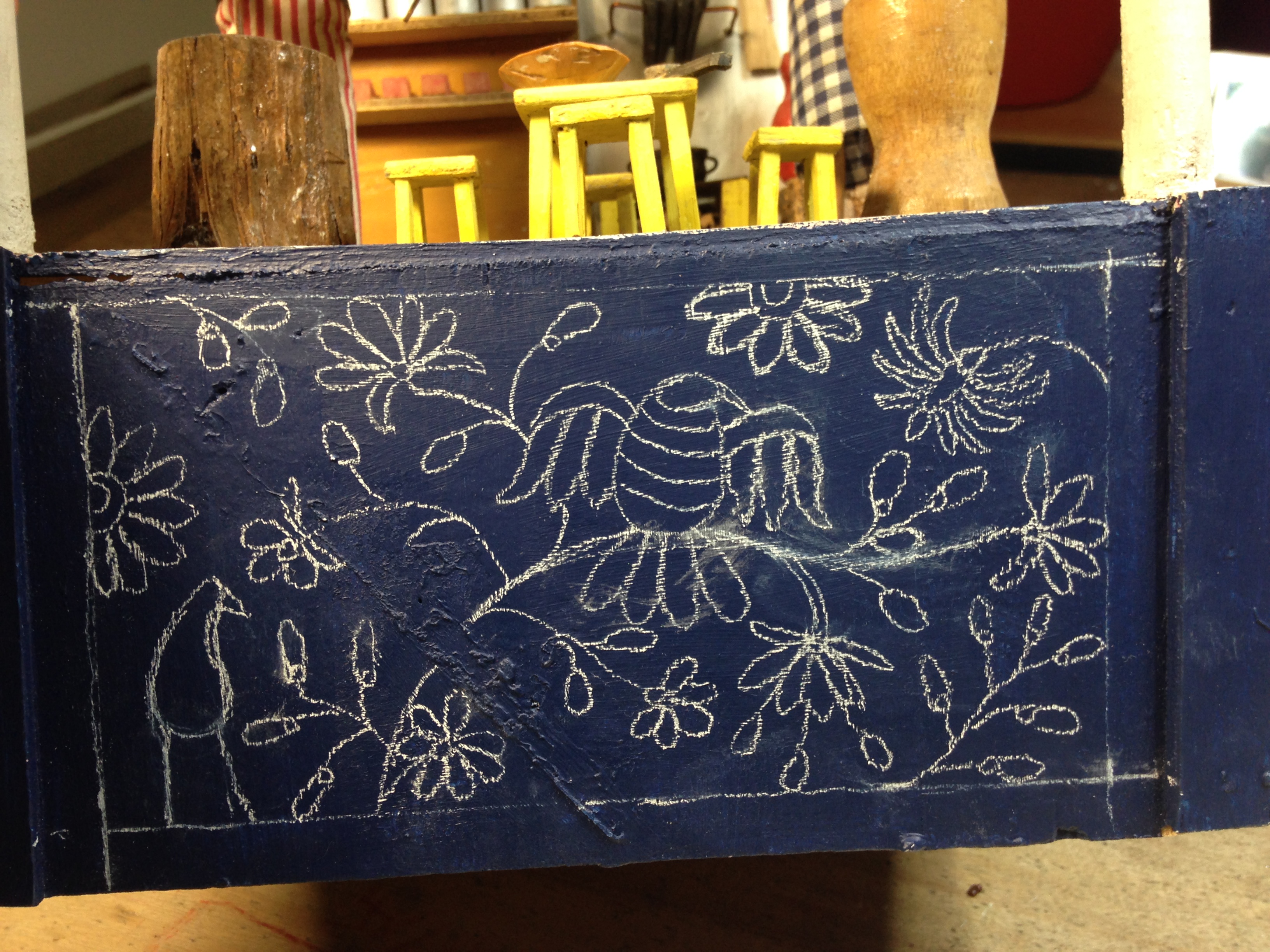 Pour commencer j’ai peint le socle avec une couleur bleu marine. Puis j’ai dessiné avec un crayon blanc les motifs.