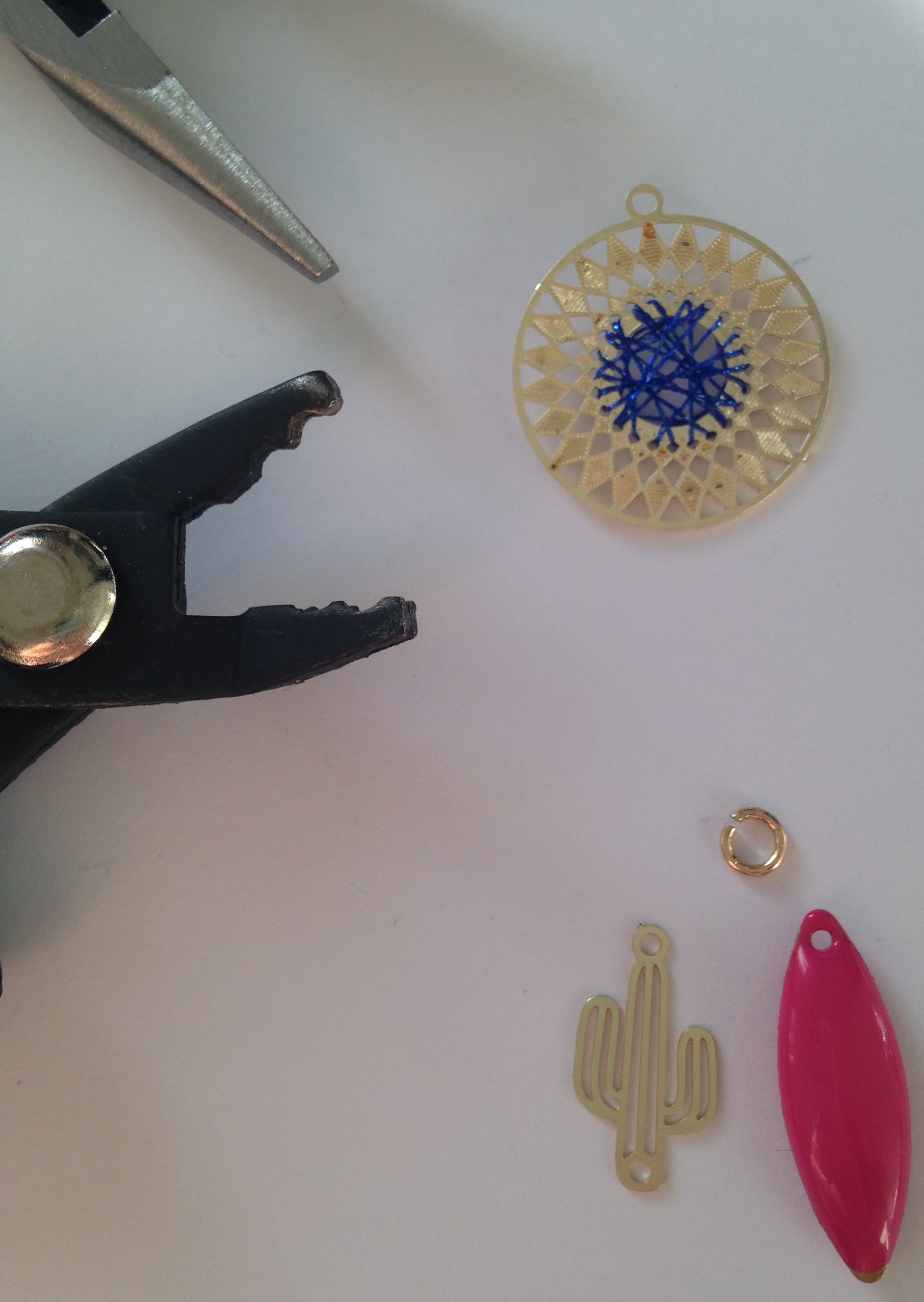 La deuxième étape consiste à fixer la petite plaque ovale, rose foncé et le cactus à la boucle d’oreille. Prendre un anneau et les deux pinces.