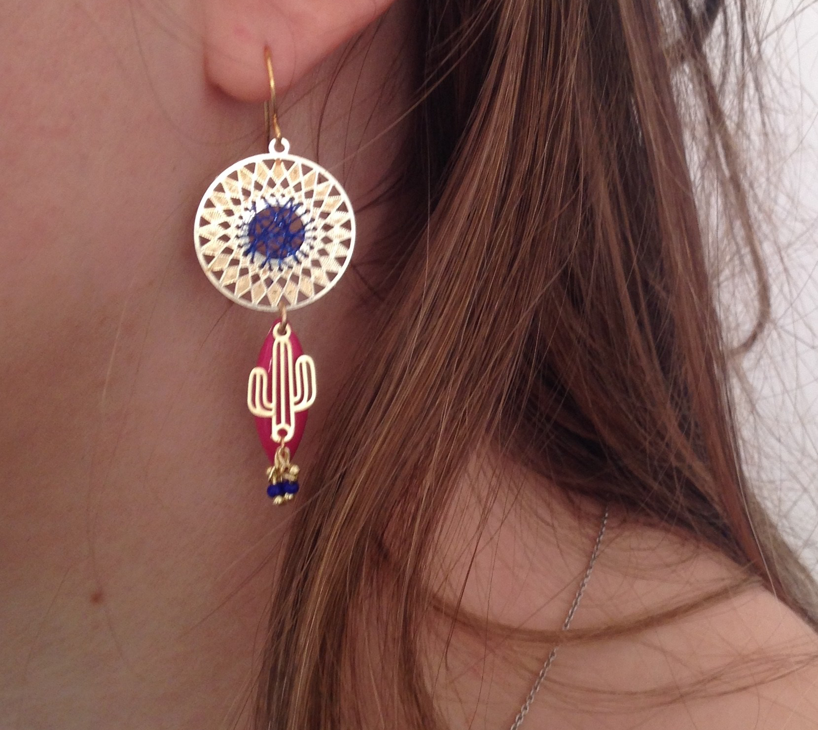 D’influence amérindienne, entre attrapes-rêves et cactus voici une jolie association pour des boucles d’oreilles à réaliser soi-même. Un cadeau original ou une pièce supplémentaire pour enrichir sa propre collection de bijoux fantaisie ! Elles peuvent également se décliner en de multiples variantes (couleurs, breloques, attaches etc…).