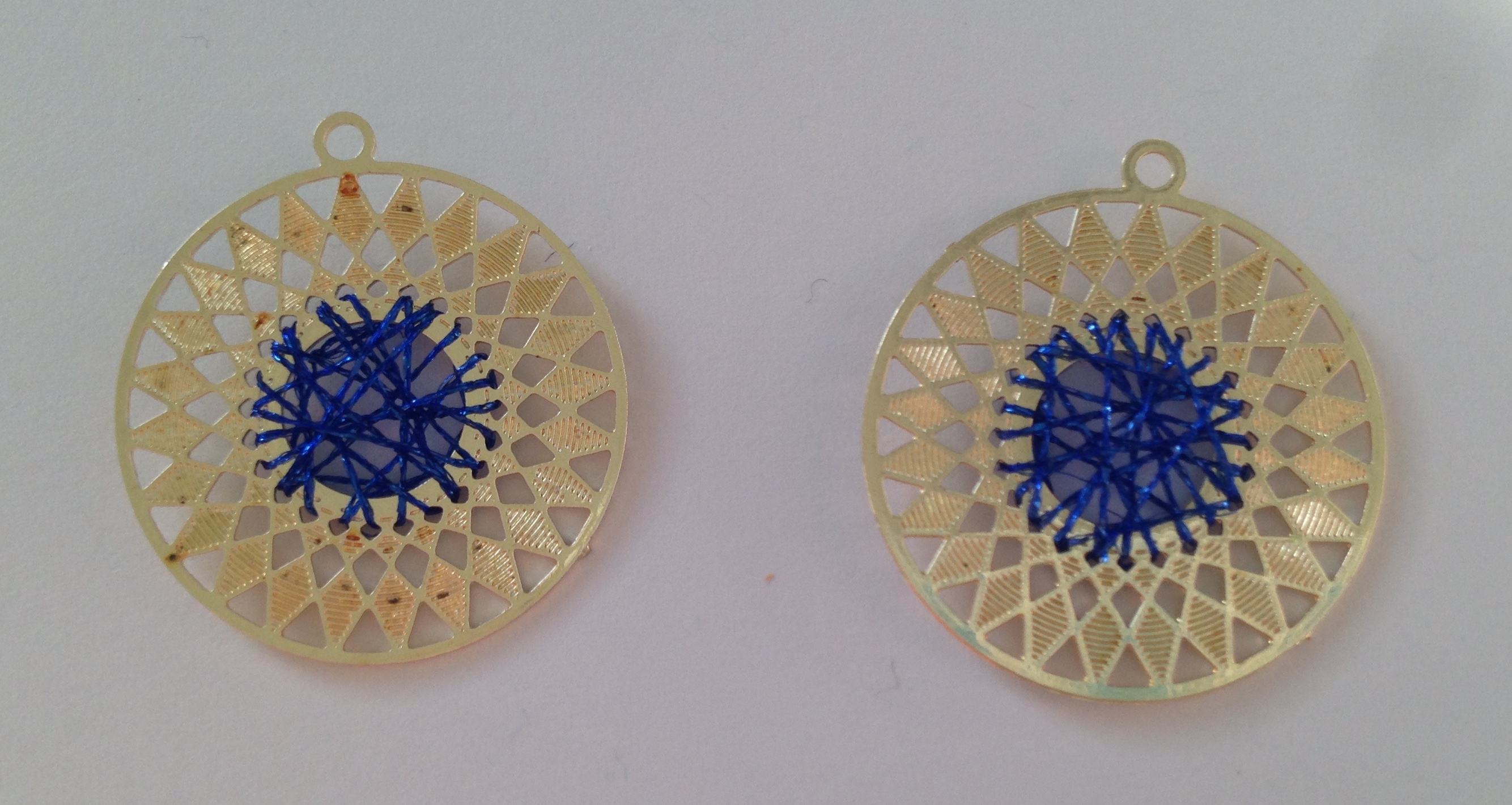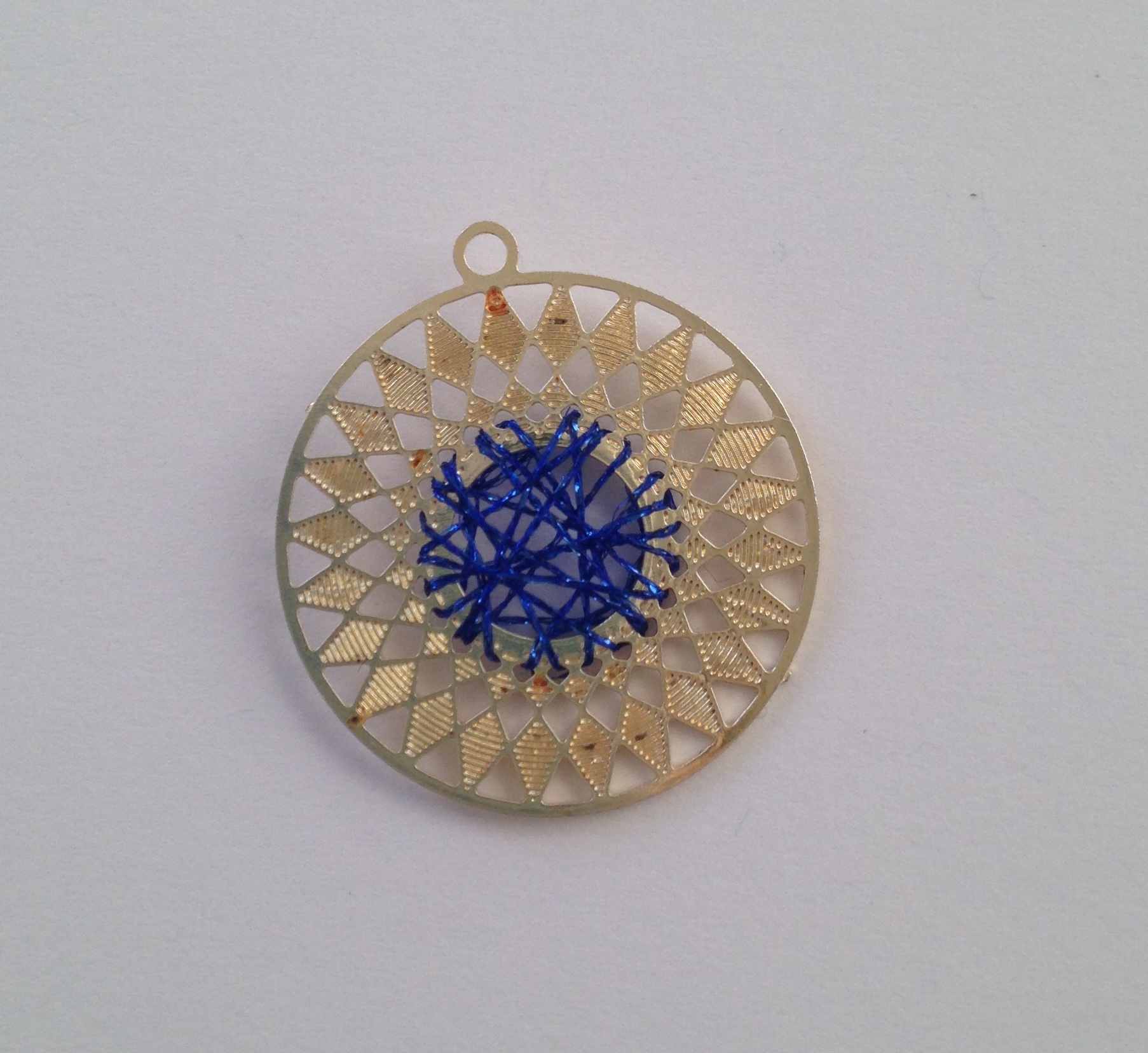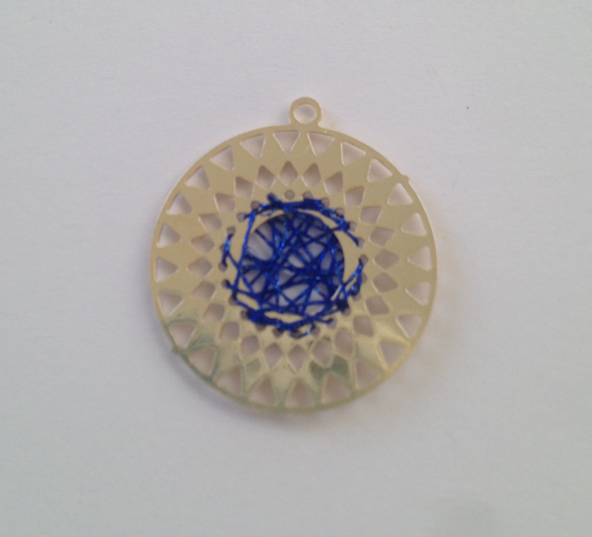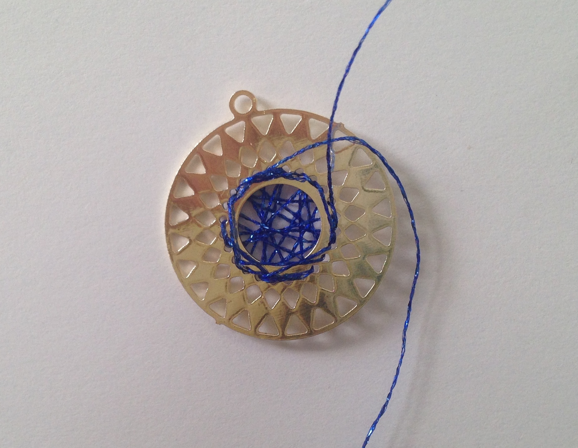 Deuxième étape : commencer par le pendentif type attrape-rêve. Prendre le fil métallisé DMC et l’aiguille fine, comme celles que l’on utilise pour les perles miyuki.