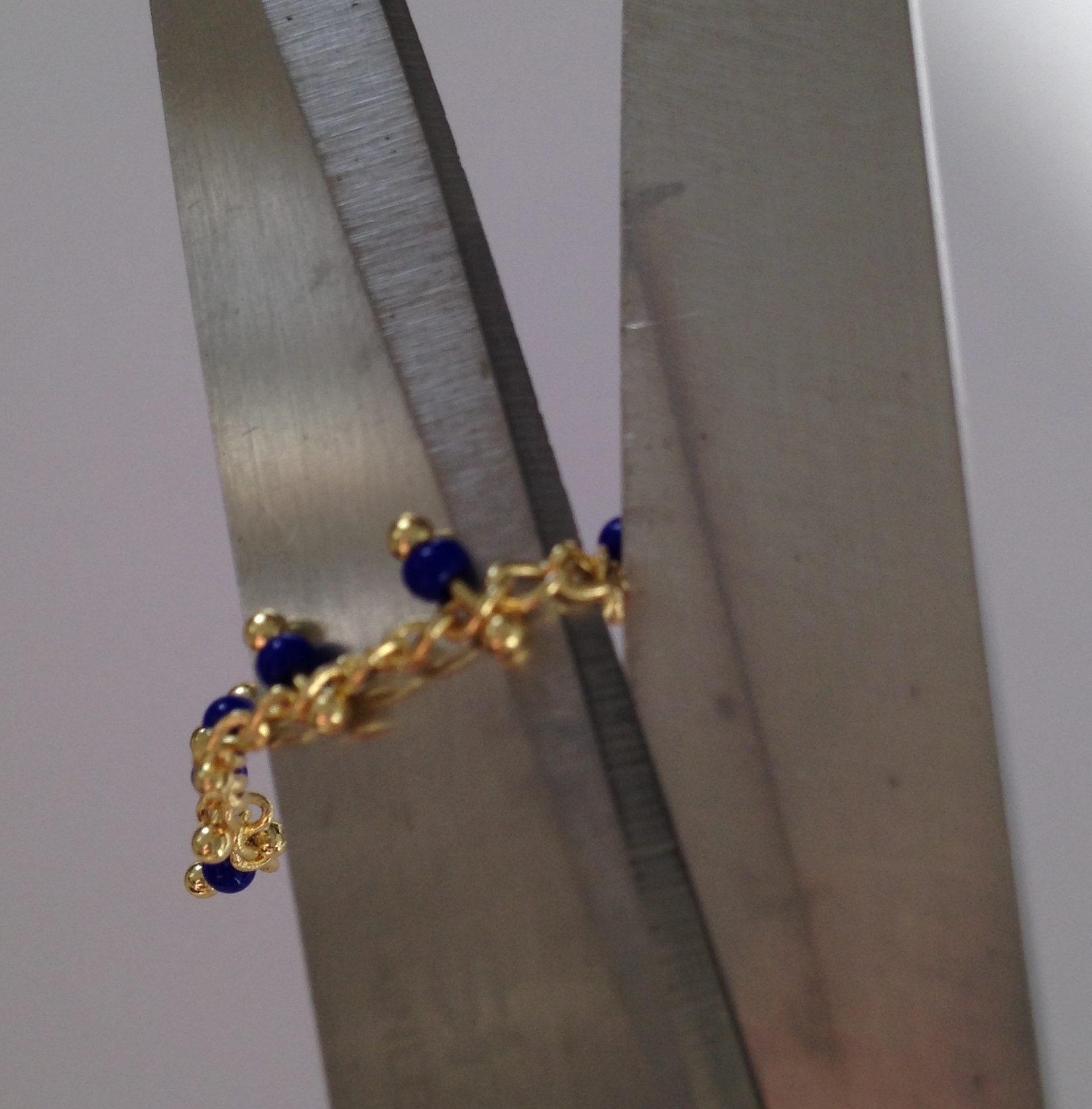 Pour la finition au bout des cactus, prendre la chaîne et les ciseaux et couper à chaque fois trois petites perles de la chaîne. Les perles sont bleues et rappellent la couleur du fil métallisé.