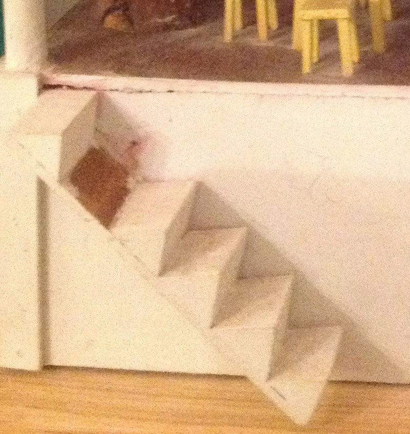 L’escalier, comme toute la maison est bois et chaque marche est une sorte de morceau de tasseau coupé en biais. Refaire une marche à l’identique m’a paru un peu compliqué dans la mesure où j’avais prévu de peindre l’ensemble. J’ai donc bricolé une marche en carton, elle est donc creuse.