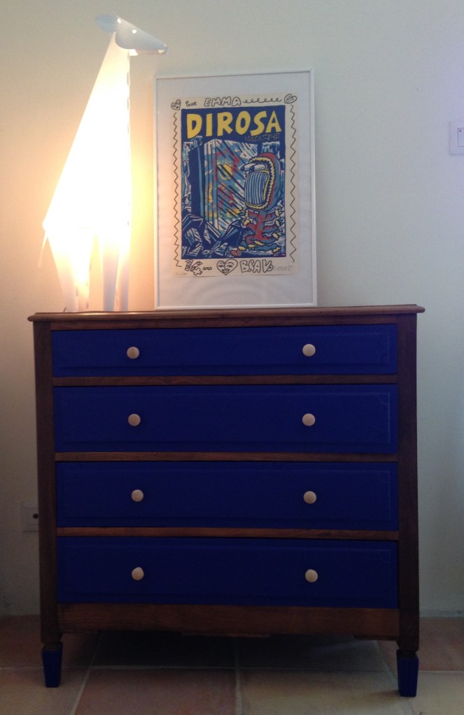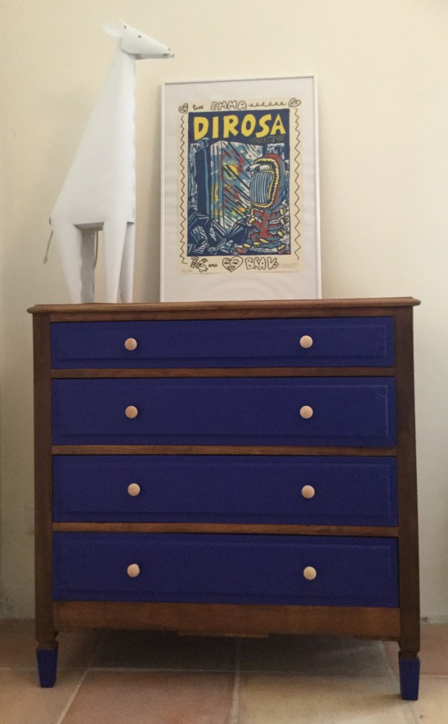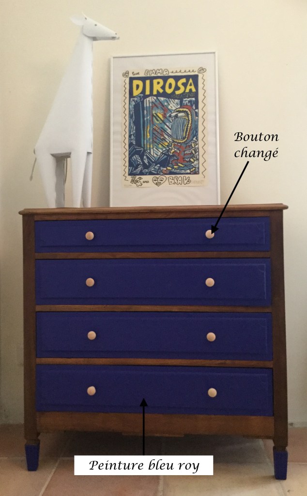 Il ne reste plus qu’à peindre en bleu roy la façade des tiroirs. Pour une petite touche de modernité peindre aussi les pieds. Enfin visser des petits boutons de bois clair à peindre en les laissant tel que.