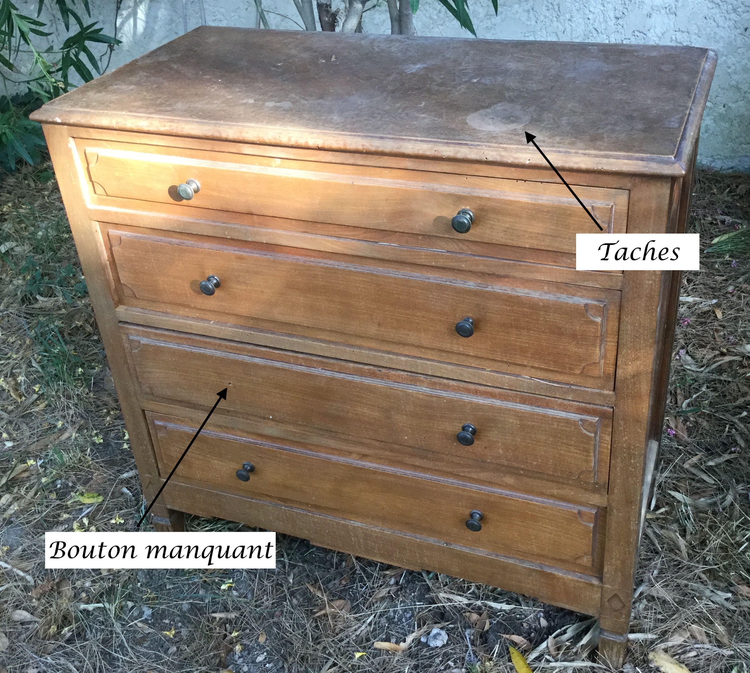 Au départ, une vieille commode récupérée lors d’un « vide-maison » pour un euro symbolique. Son premier atout était sa taille, pas très grande, pas très profonde elle pouvait facilement trouver sa place dans une petite chambre. Aucun défaut majeur ou en tout cas aucun qui ne puisse trouver une solution. Quelques trous attestant la présence de vers à bois, des taches sur le plateau, un bouton en moins sur un des tiroirs…Mais un grand besoin d’un coup de neuf !