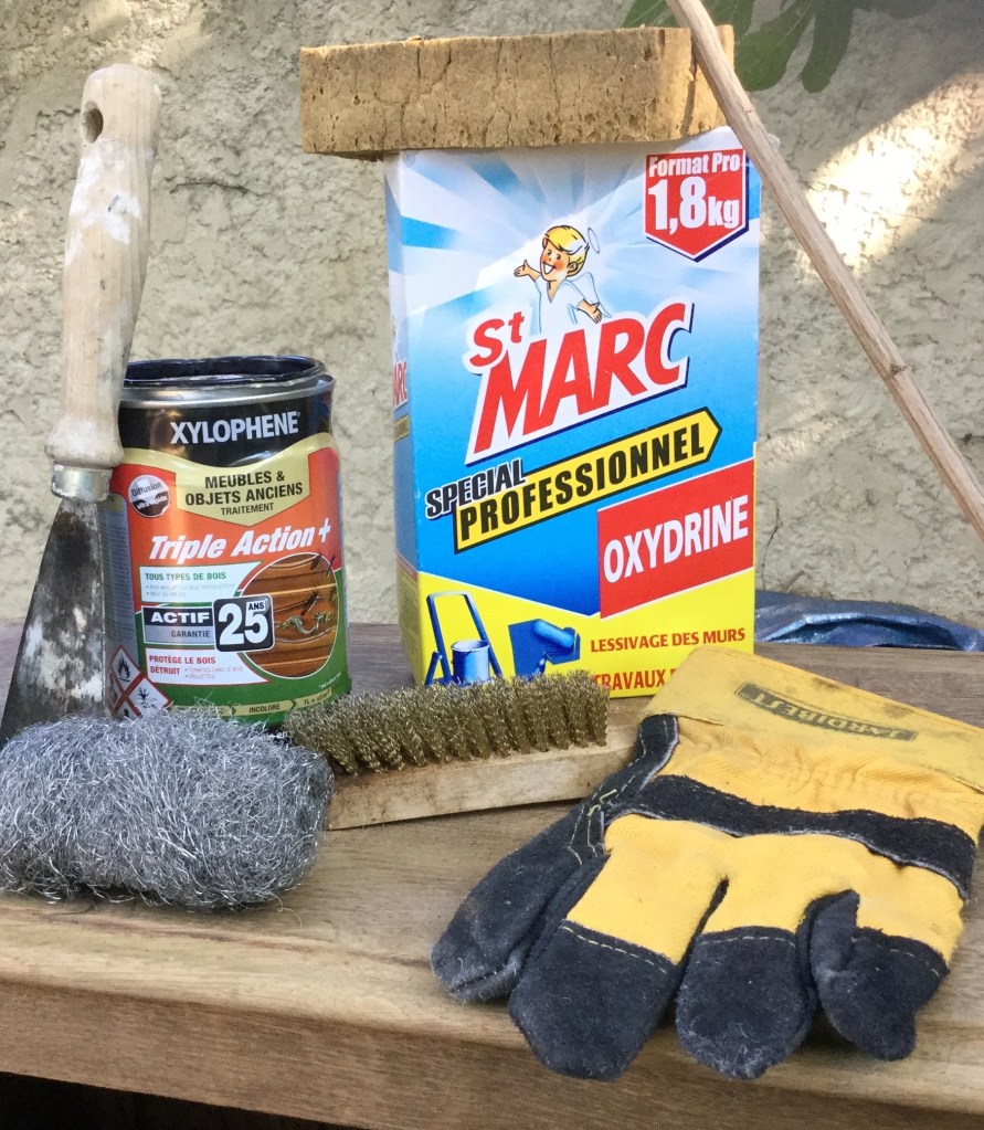 La première étape : nettoyage en grand avec de la lessive St Marc, puis décapage à la paille de fer puis passage de xylophène contre les vers. J’aurais préféré utiliser un produit moins dangereux pour l’environnement mais la présence des vers était trop ancienne pour que des produit comme le vinaigre blanc soit efficace.