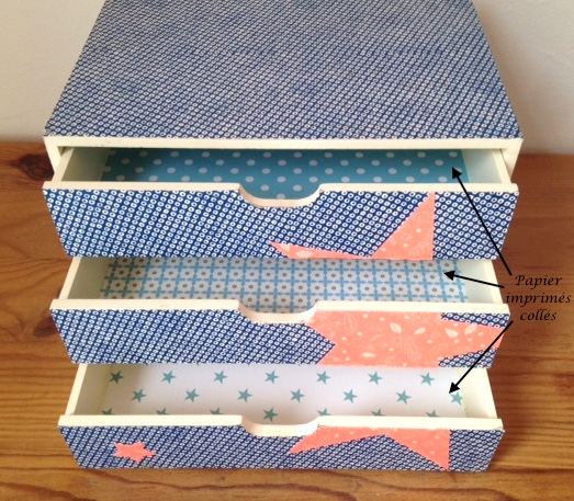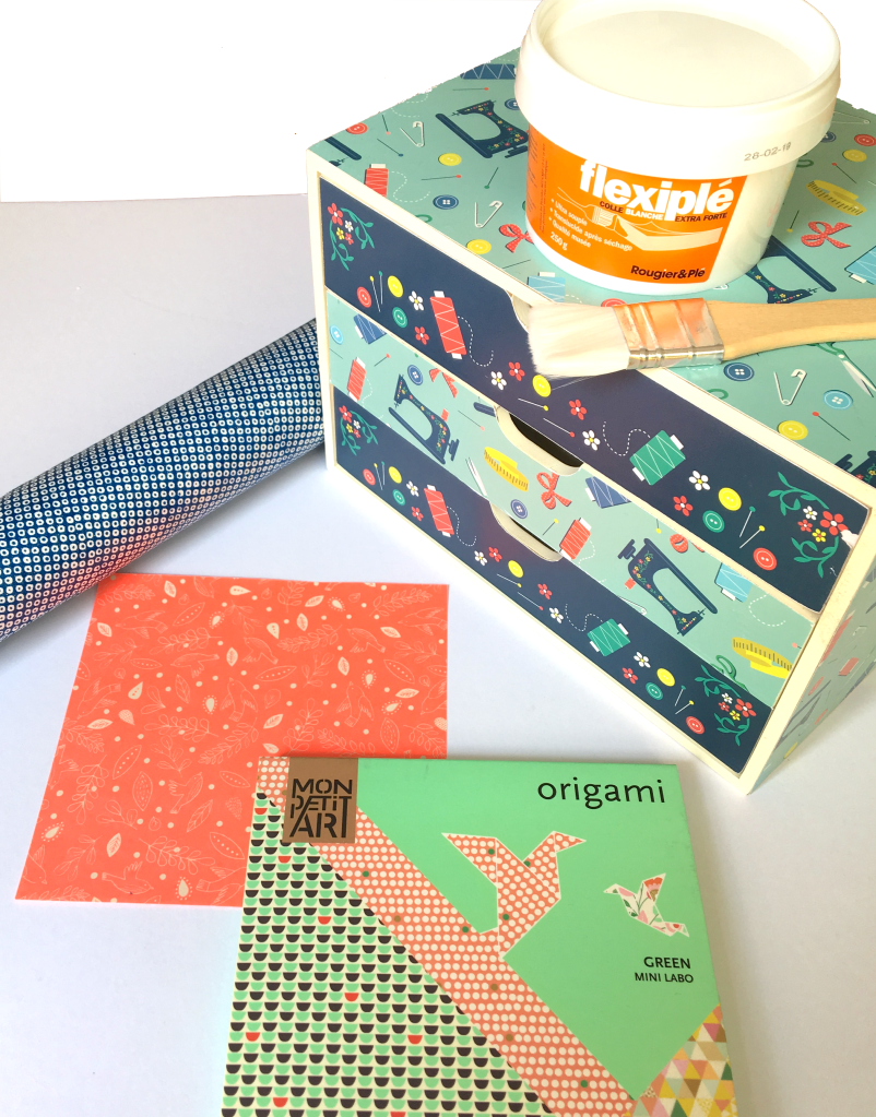 Choisir un papier vendu à la feuille, ici un motif japonais pour le fond, un papier plus fantaisie pour les étoiles par exemple une feuille pour origami dans les collections Mon Petit Art https://www.lesenfantsdudesign.com/kit-origami-vert-mon-petit-art-p7889.html, trois papiers assortis pour l’intérieur des tiroirs et enfin de la colle blanche de type Flexiplé en vente chez https://www.rougier-ple.fr/colle-blanche-vinylique-flexiple-250g.r.html.