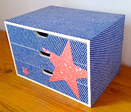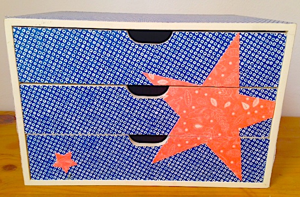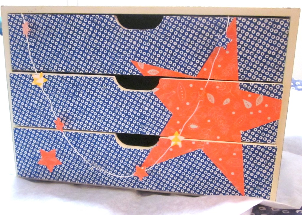 Découper l’étoile et la reporter sur le papier à motif. Découper à nouveau l’étoile mais cette fois ci dans le papier imprimé. Faire des essais pour choisir l’emplacement. Coller à cheval sur les trois tiroirs, si l’espace entre eux est trop grand, les sortir du meuble, les rapprocher avant de coller l’étoile. Passer, délicatement un cutter entre les tiroirs pour couper l’étoile. Replacer les tiroirs. Faire une étoile plus petite de la même façon et la coller sur une face de tiroir.