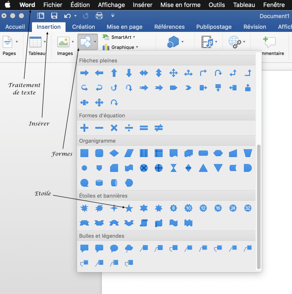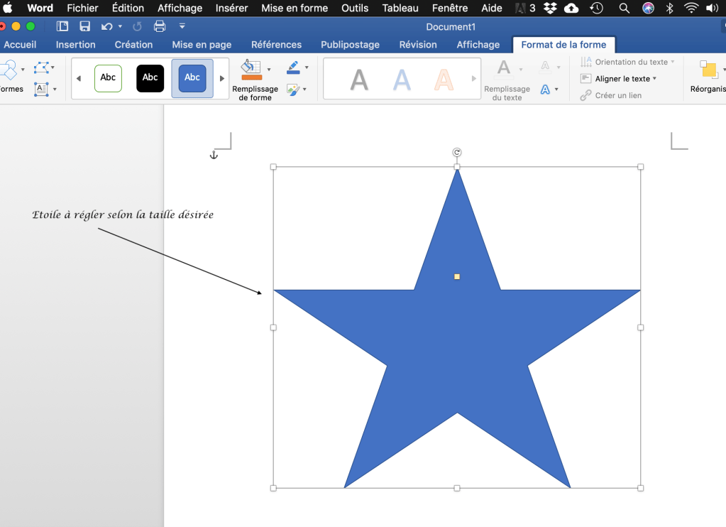 Pour réaliser l’étoile, utiliser un traitement de texte, aller dans insérer, choisir formes et sélectionner une étoile. Ajuster à la taille voulue puis imprimer.