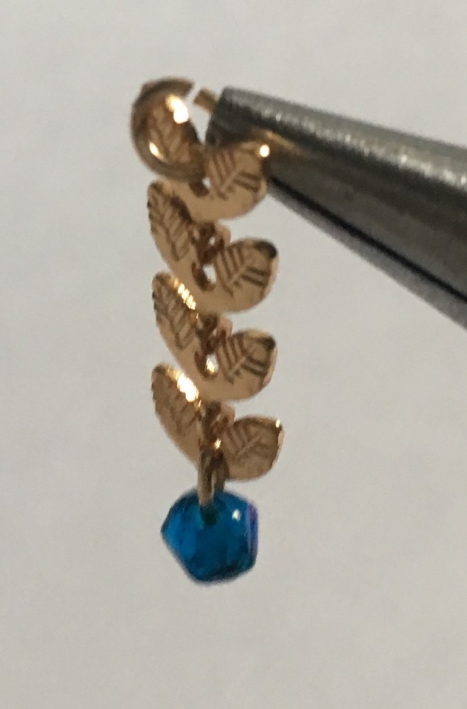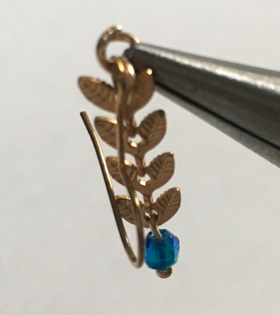 Il faut désormais insérer un anneau sur l’épi du haut. Cet anneau doit être accroché à un second anneau qui lui sera accroché au fermoir de la boucle d’oreille.