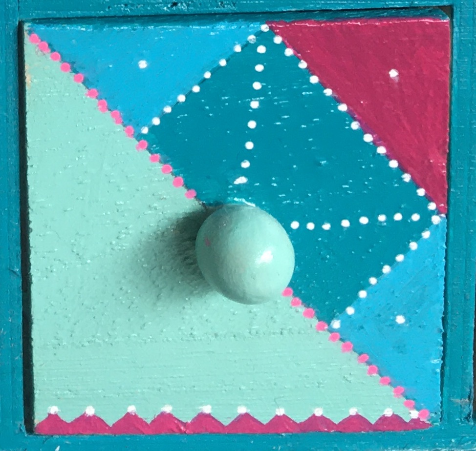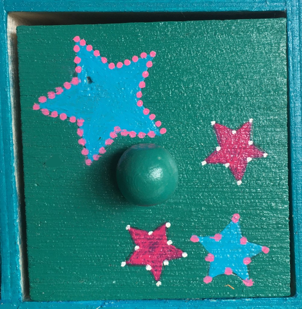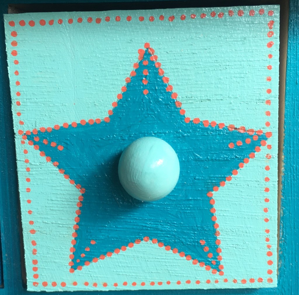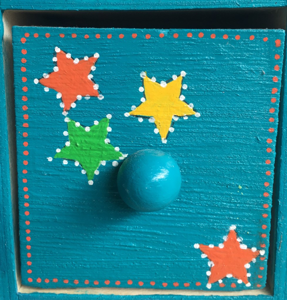 Peindre ensuite les tiroirs. Tout est possible ! On peut utiliser des pochoirs pour dessiner le motif, on peut faire ses propres pochoirs avec des perforatrices par exemple pour les grandes étoiles. Si l’ensemble est assez impressionnant, la réalisation n’est pas si difficile, il suffit d’un minimum de minutie et d’un peu d’audace. A cette échelle les erreurs sont très facilement rattrapables, il suffit de quelques petits points au marqueur Posca pour transformer une ligne irrégulière en une bordure délicate.