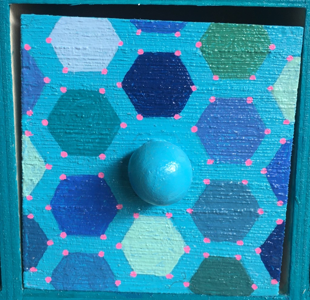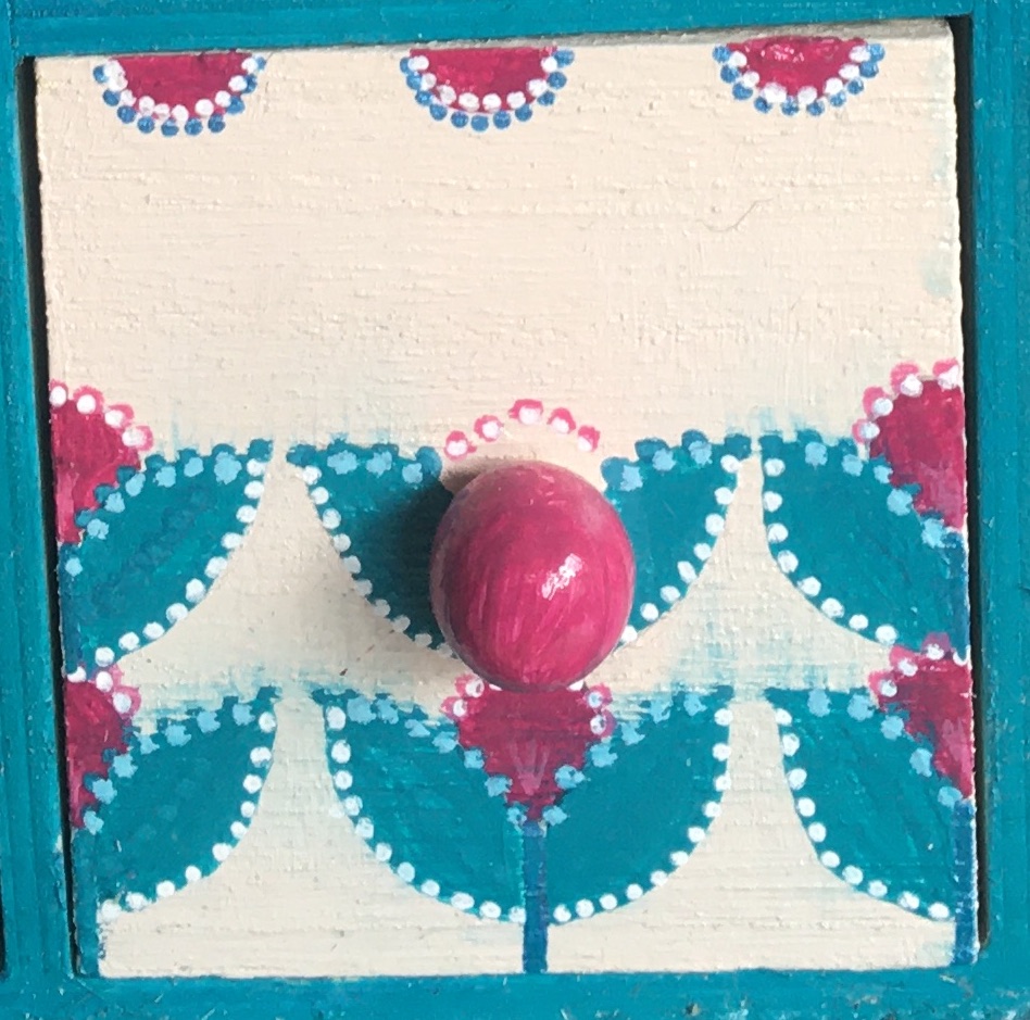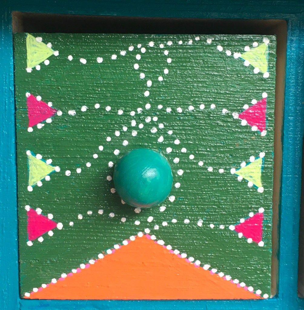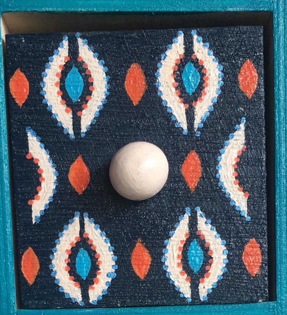 Peindre ensuite les tiroirs. Tout est possible ! On peut utiliser des pochoirs pour dessiner le motif, on peut faire ses propres pochoirs avec des perforatrices par exemple pour les grandes étoiles. Si l’ensemble est assez impressionnant, la réalisation n’est pas si difficile, il suffit d’un minimum de minutie et d’un peu d’audace. A cette échelle les erreurs sont très facilement rattrapables, il suffit de quelques petits points au marqueur Posca pour transformer une ligne irrégulière en une bordure délicate.