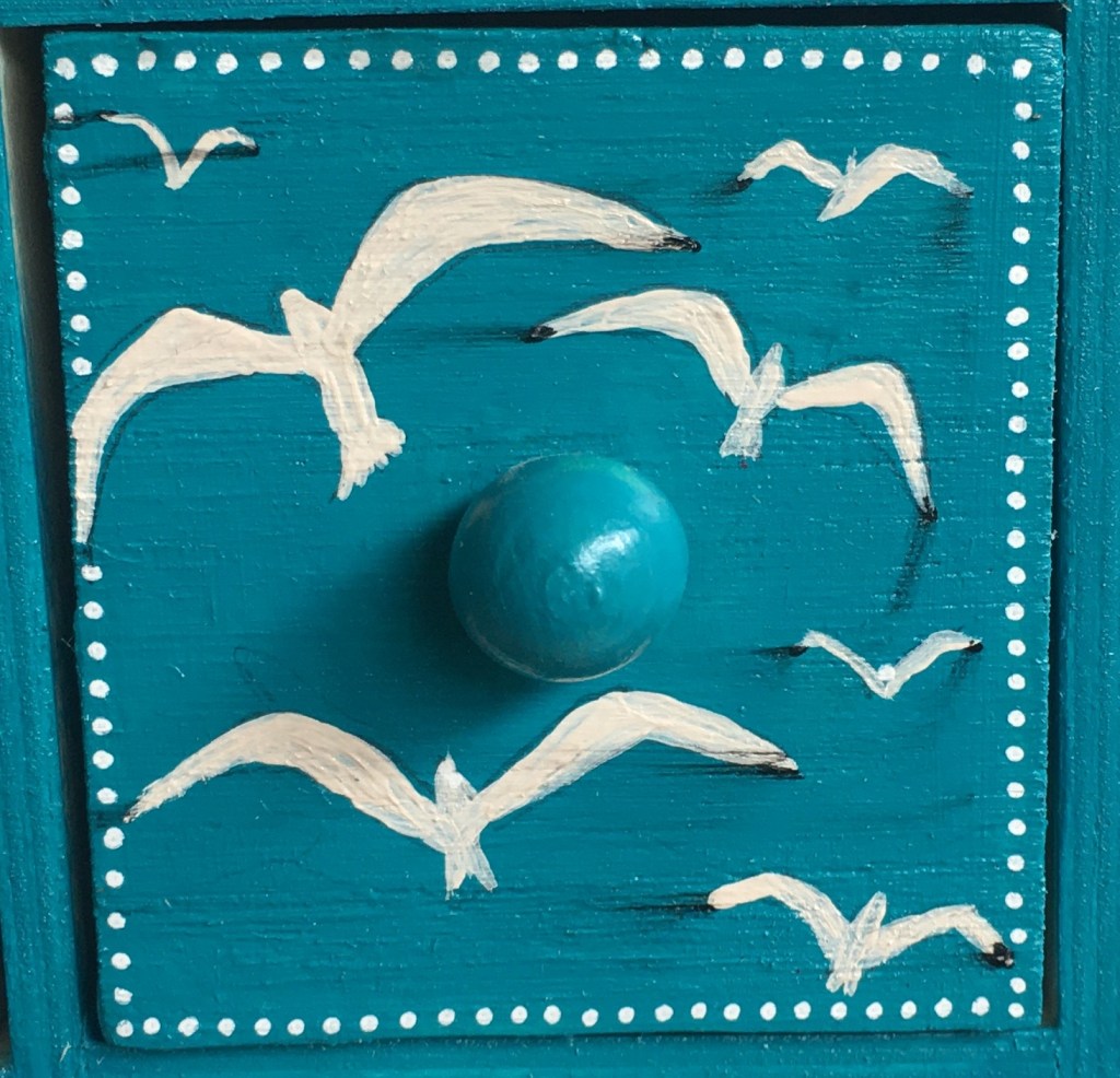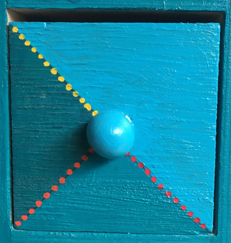 Commencer par peindre en bleu canard le cadre du meuble c’est-à-dire les côtés, le dessus et les tranches de la face. Selon le goût, une couche peut suffire, le bois est alors visible par transparence ou pour une version plus opaque passer une deuxième couche. Ne pas peindre les tiroirs.