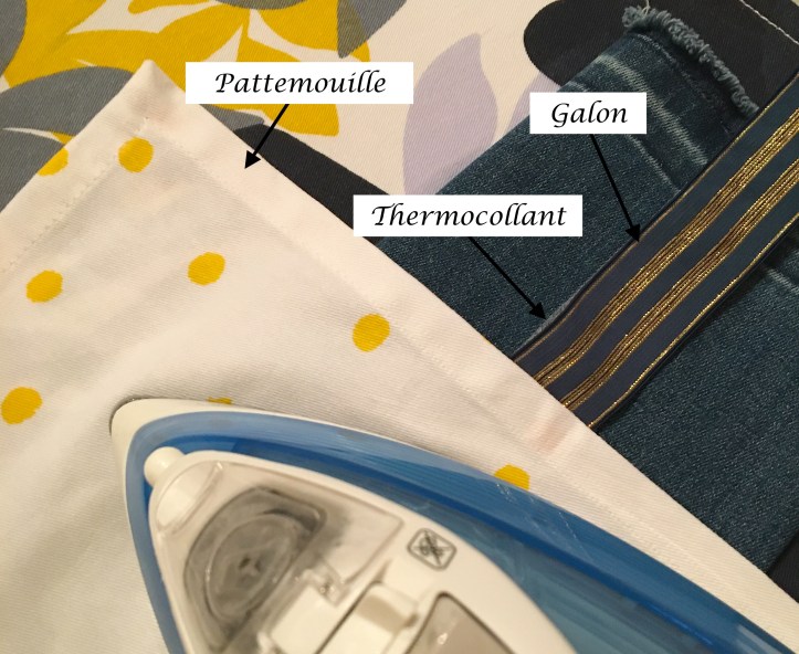 Positionner la bande de thermocollant sur la jambe du jean en faisant bien attention à la centrer. Petit à petit, avec le fer à repasser en utilisant une pattemouille fixer le ruban élastique. L’utilisation d’une pattemouille c’est-à-dire d’un tissu de coton propre que l’on intercale entre le ruban et le fer à repasser a pour fonction de protéger le ruban de la chaleur nécessaire au thermocollant pour fondre.