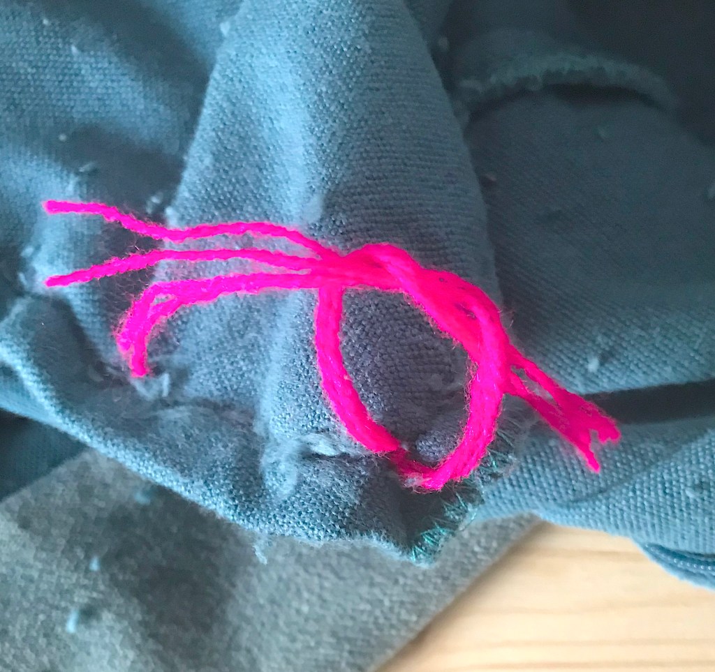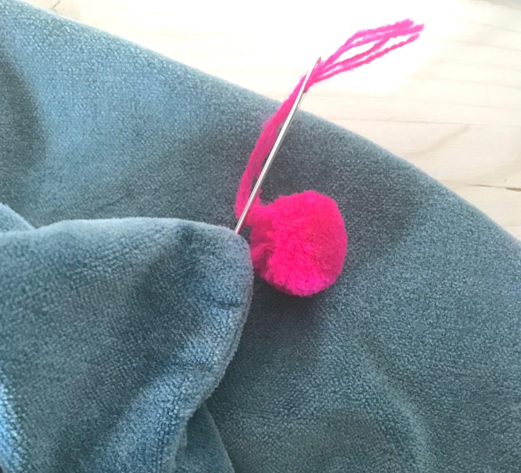 Laver les coussins. Avec l’aiguille, passer les brins de laine du pompon, en deux fois et dans un angle du coussin. (Voir les photos ci après).