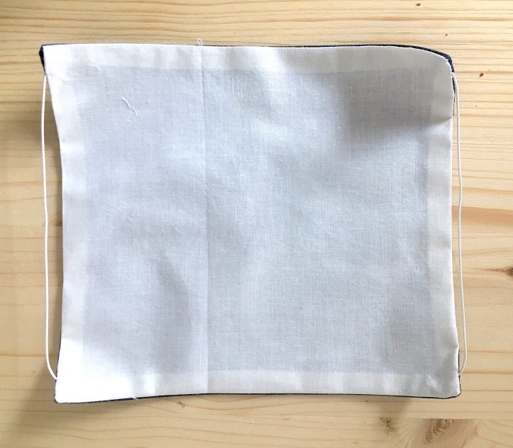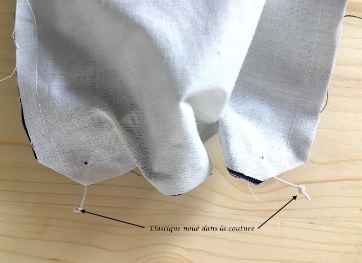 Préparer les élastiques, couper 2 morceaux de 16 cm (à ajuster selon la taille du visage). Retourner l’ouvrage endroit à l’intérieur. Faire un repère sur l’envers à environ 1,4 cm du bord haut ou du bord bas. Avec une grosse aiguille à large chas, passez un côté de l’élastique de l’intérieur vers l’extérieur (passer dans un point) puis faire un double noeud. Faire de même à l’autre extrémité puis de l’autre côté du masque. Repasser pour bien écraser les coutures et les angles.