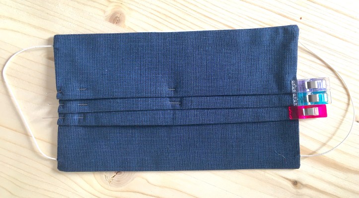 A l’aide du patron placer les repères des plis, sur l’envers. Plier en orientant les plis vers le bas du masque. Les fixer avec des épingles ou des pinces.