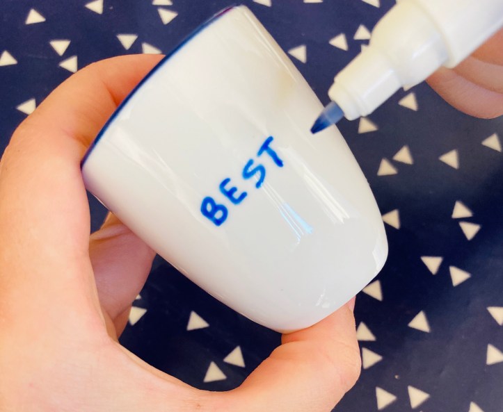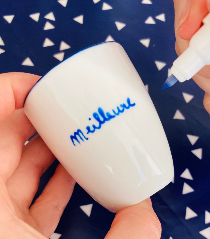 Une fois les messages choisis et écrits, suivre les instructions inscrites sur le stylo : laisser sécher 24 heures puis cuire 35 minutes à 150 degrés donc dans un simple four. Les tasses passent ensuite parfaitement au lave-vaisselle.