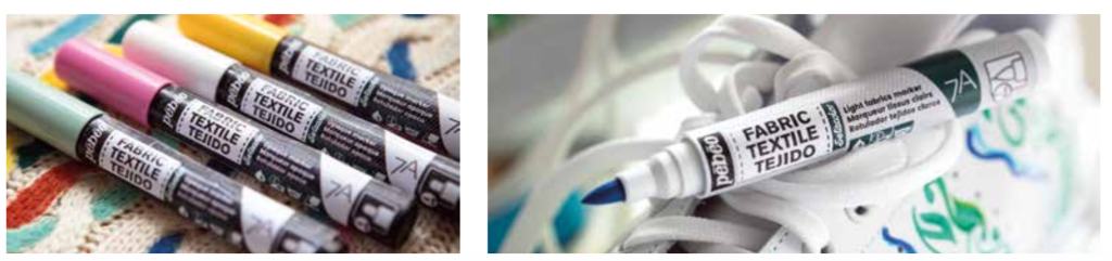 Avant de commencer, glisser un morceau de carton lisse sous une seule épaisseur du tissu de façon, non seulement à avoir une surface rigide pour faciliter le travail mais aussi pour éviter que la couleur ne tache l’autre côté du vêtement. Prendre les feutres et colorer les motifs.