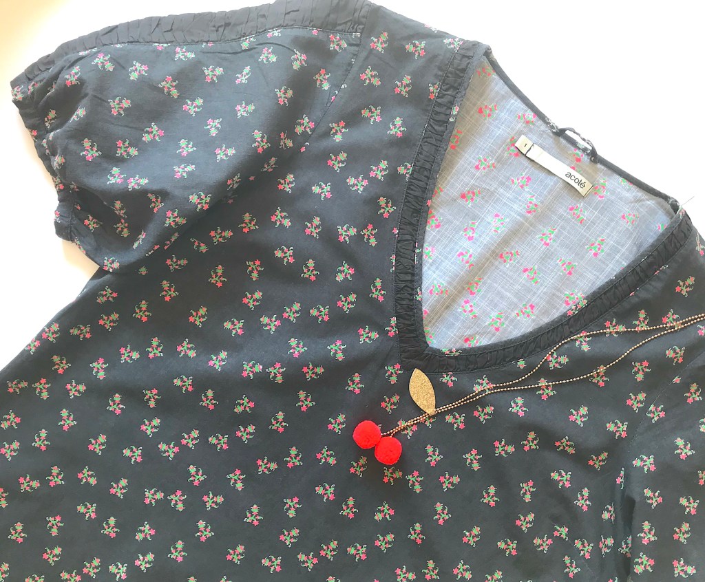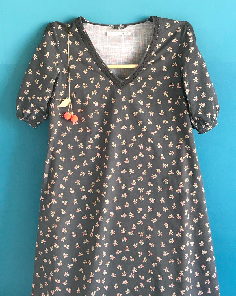 Voici une jolie rob, ici de la marque acoté dont la coupe est particulièrement seyante, à la fois originale par ses manches et son décolleté en V et très agréable à porter grâce à son tissu de coton. Seul petit bémol : les couleurs un peu ternes qui donnent l’impression que le tissu a été délavé. Le fond est gris et les fleurs sont rose et vert très pâle. Le challenge a donc consisté à lui donner un petit coup de peps en coloriant les motifs avec des stylos spécialement adaptés au tissu qui se fixe avec un simple fer à repasser, sans vapeur.