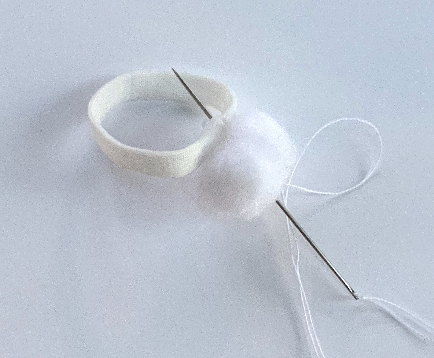 Pour le bandeau, couper un morceau de tube élastique à la taille de la tête de la souris, fermer par quelques points, à la main. Sur la couture, coudre le pompon.
