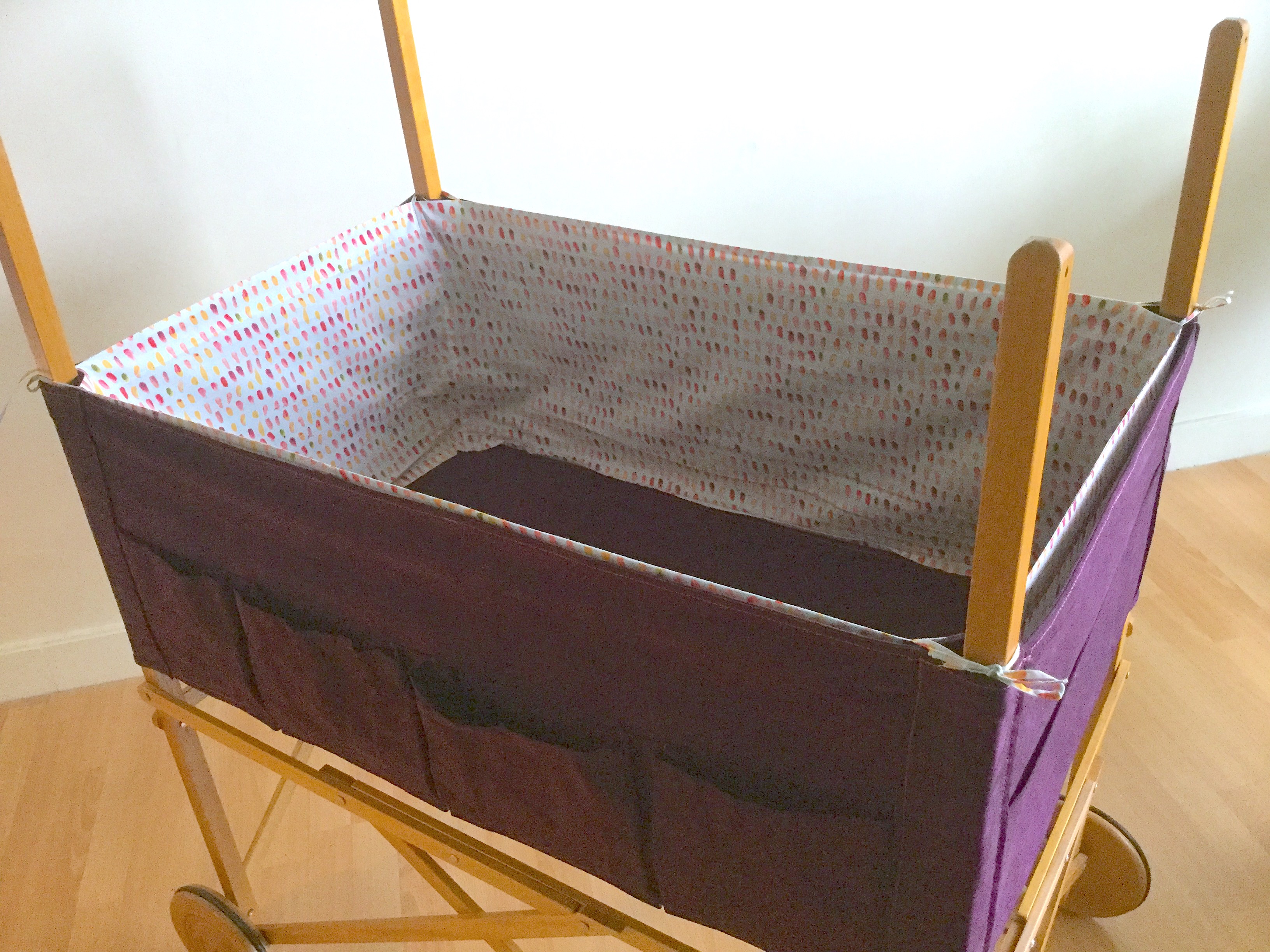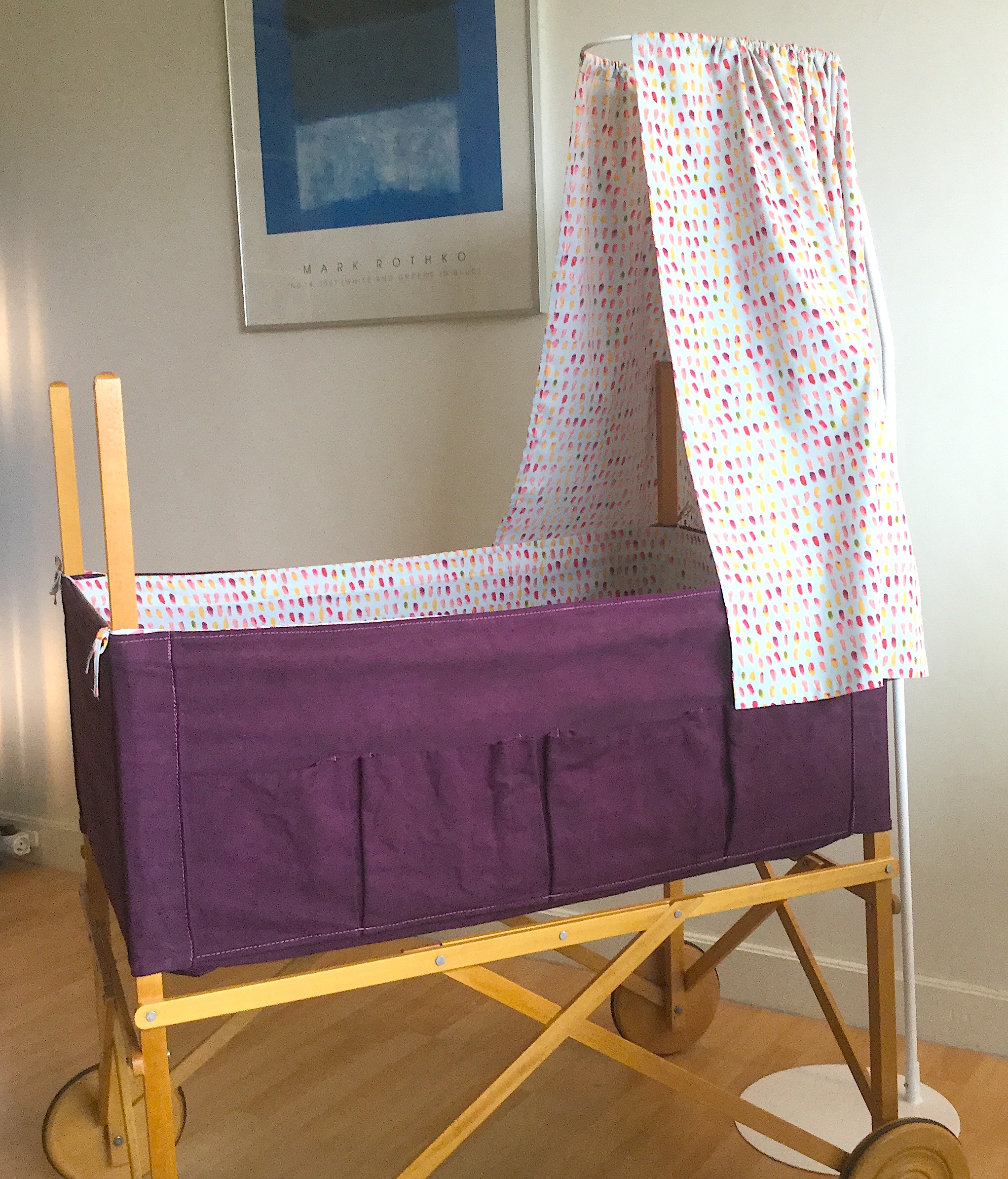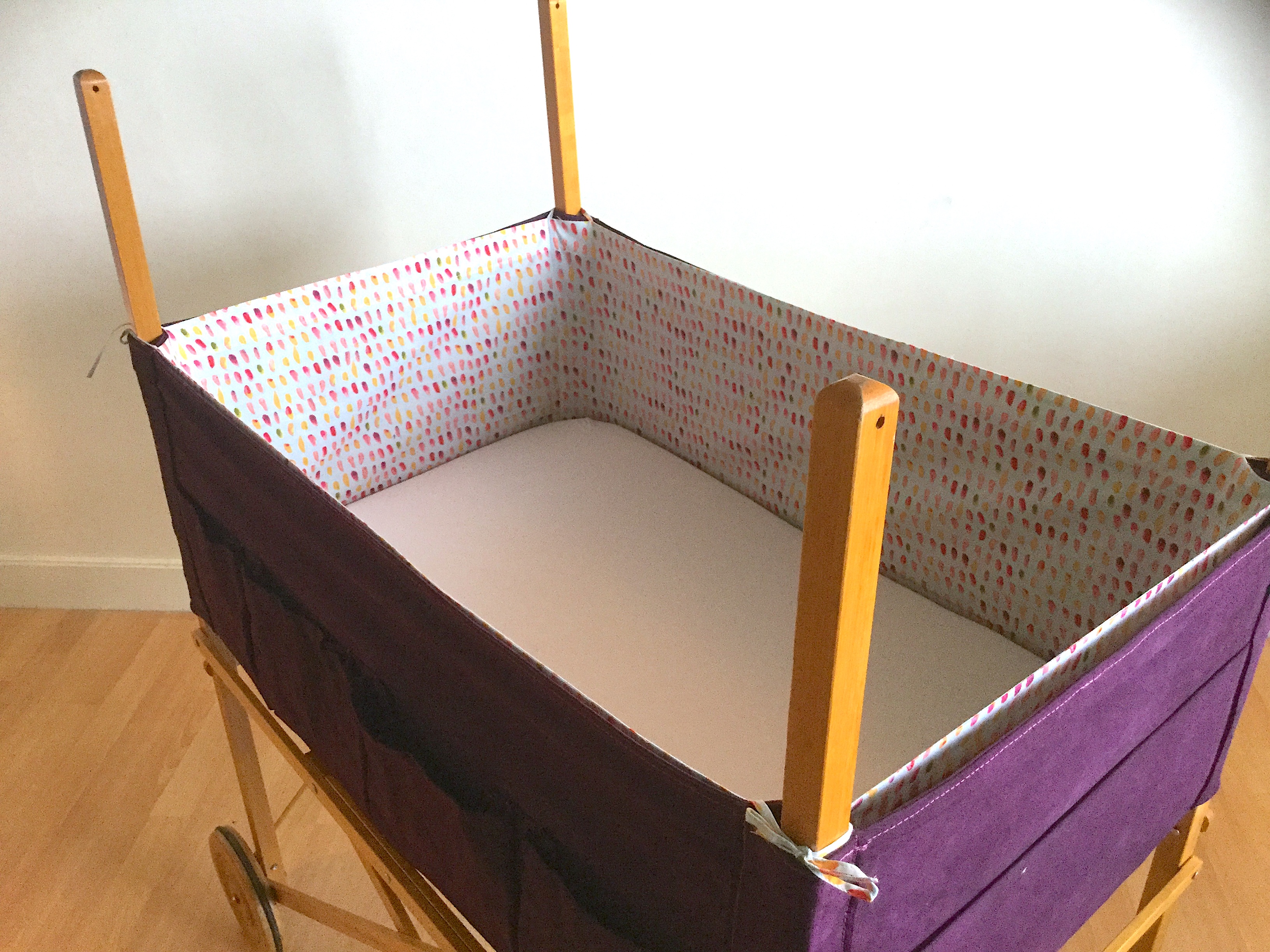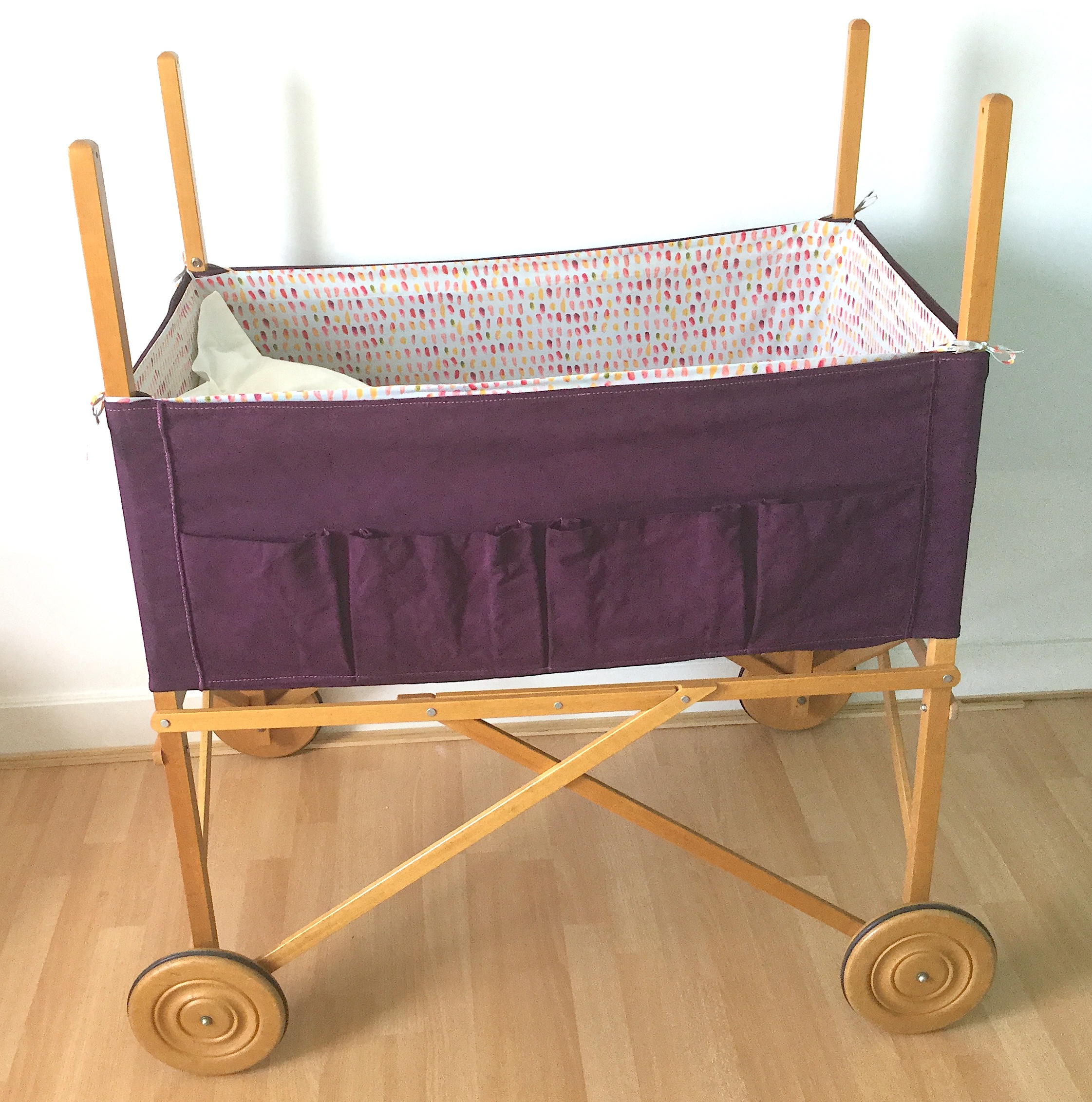 Il y a plus de trente ans, un des berceaux les plus tendances mariait avec élégance le bois et la toile blanche. Le format était généreux et pouvait donc accueillir un bébé jusqu’à 4 mois environ. Mais, à l’époque il coûtait très cher et j’avais dû y renoncer sans jamais l’oublier. Une génération plus tard, par hasard le voici en vente sur un site d’occasion ! Je ne pouvais pas le manquer. Sauf qu’une fois récupéré son état n’était pas parfait, la toile avait jaunie, quelques taches de rouille étaient visibles près des oeillets…..enfin…. il fallait lui donner un petit coup de neuf. Je me suis alors lancée dans la teinture mais ma machine n’étant pas assez grande je me suis adressée à un teinturier professionnel et j’ai choisi un beau prune dense et lumineux. J’ai ajouté une flèche de lit, un tissu de coton imprimé pour le tour du berceau et le ciel et ainsi redonné une seconde vie à ce berceau.