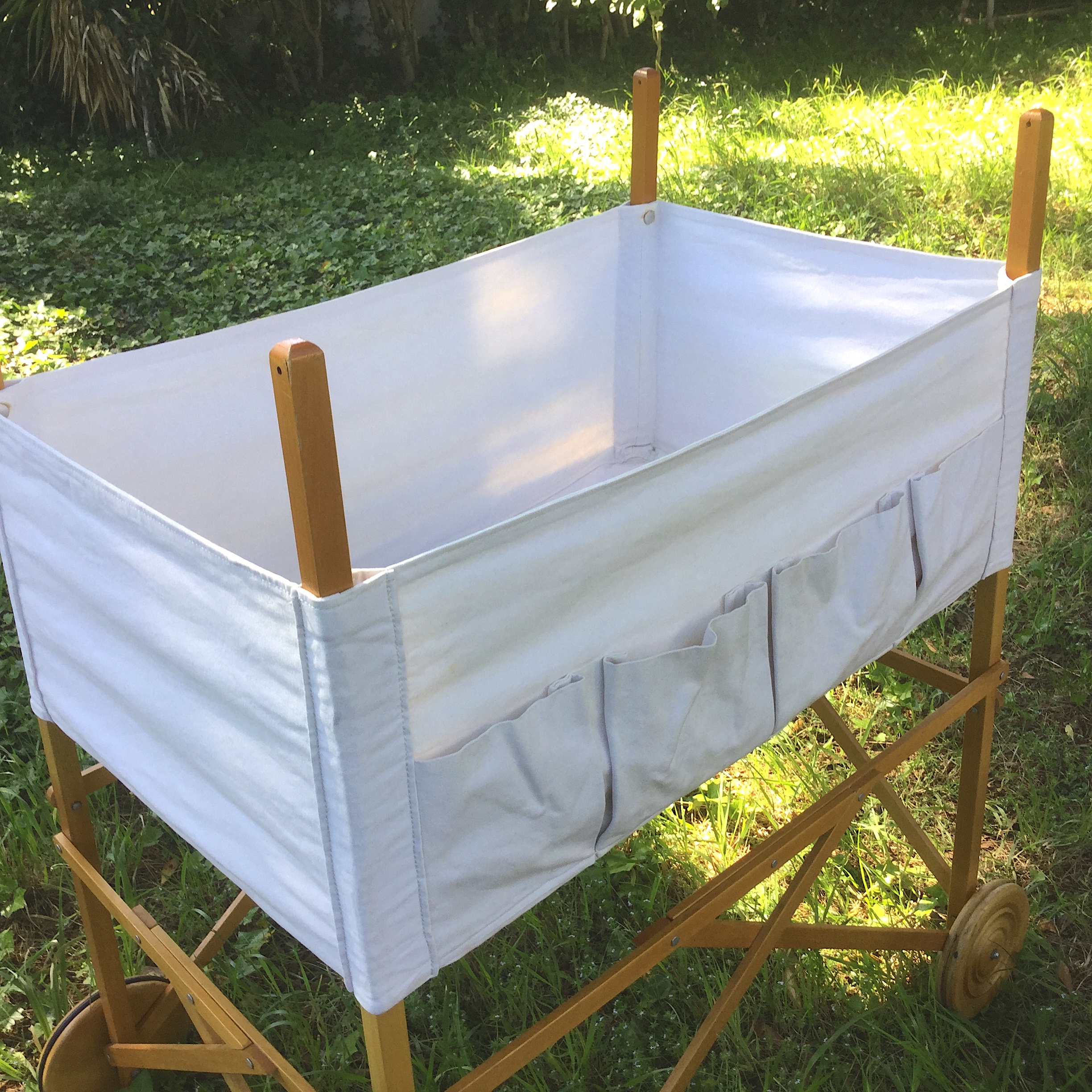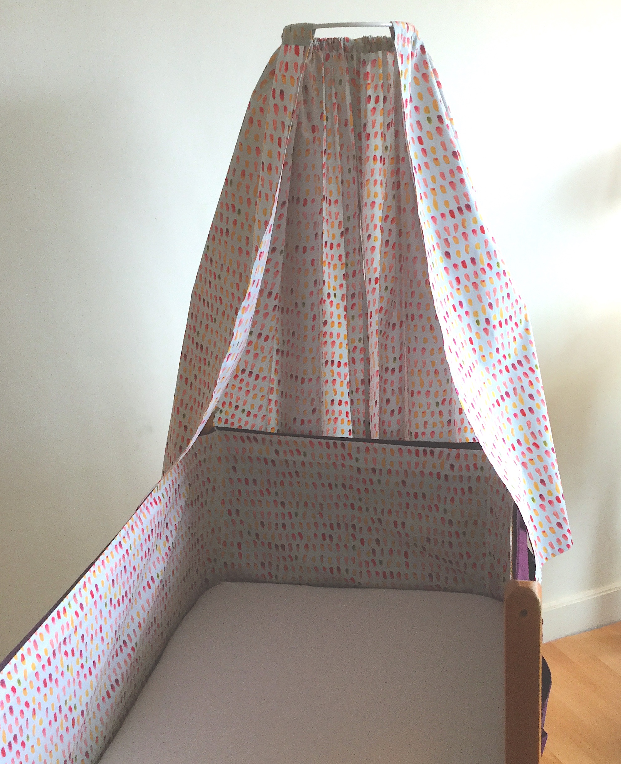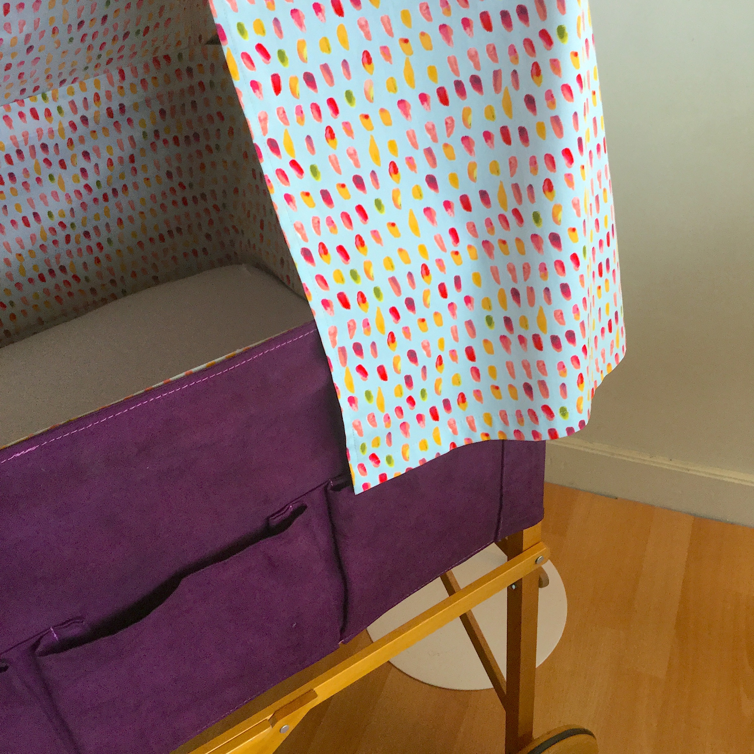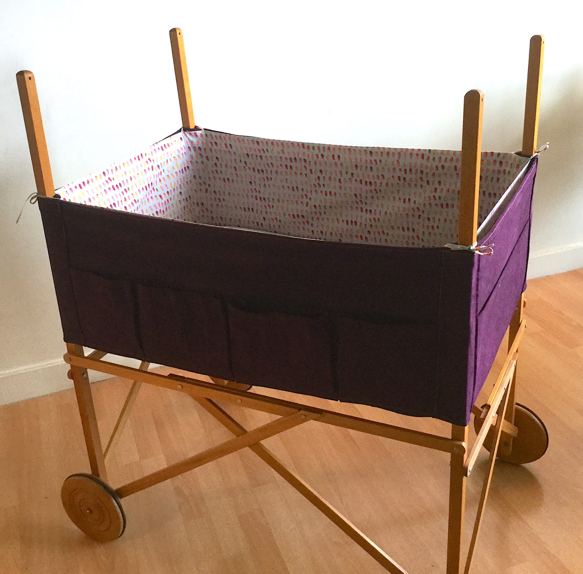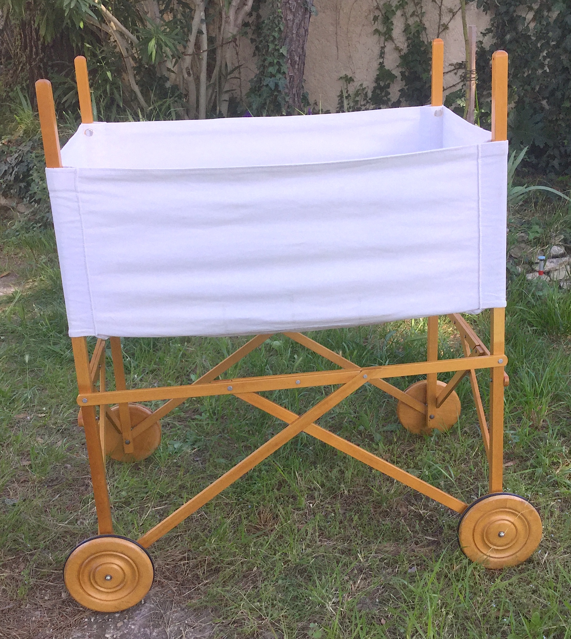 Il y a plus de trente ans, un des berceaux les plus tendances mariait avec élégance le bois et la toile blanche. Le format était généreux et pouvait donc accueillir un bébé jusqu’à 4 mois environ. Mais, à l’époque il coûtait très cher et j’avais dû y renoncer sans jamais l’oublier. Une génération plus tard, par hasard le voici en vente sur un site d’occasion ! Je ne pouvais pas le manquer. Sauf qu’une fois récupéré son état n’était pas parfait, la toile avait jaunie, quelques taches de rouille étaient visibles près des oeillets…..enfin…. il fallait lui donner un petit coup de neuf. Je me suis alors lancée dans la teinture mais ma machine n’étant pas assez grande je me suis adressée à un teinturier professionnel et j’ai choisi un beau prune dense et lumineux. J’ai ajouté une flèche de lit, un tissu de coton imprimé pour le tour du berceau et le ciel et ainsi redonné une seconde vie à ce berceau.