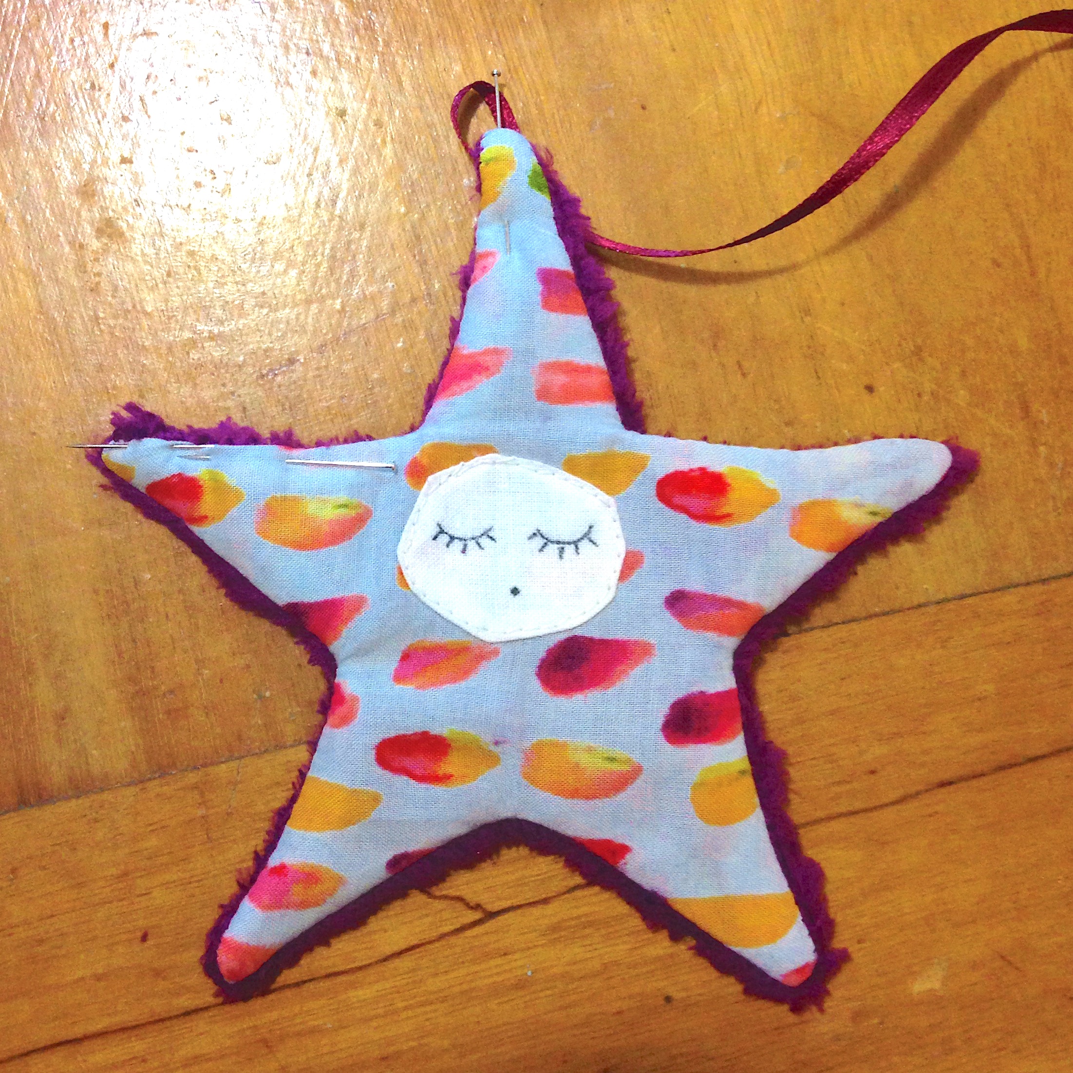 Pour veiller sur le sommeil de bébé, une petite étoile dans un tissu fausse fourrure prune et le coton du tour de lit, un petit cercle de coton blanc, quelques traits de stylo noir spécial tissu, un ruban pour la suspendre et bébé peut dormir tranquille.