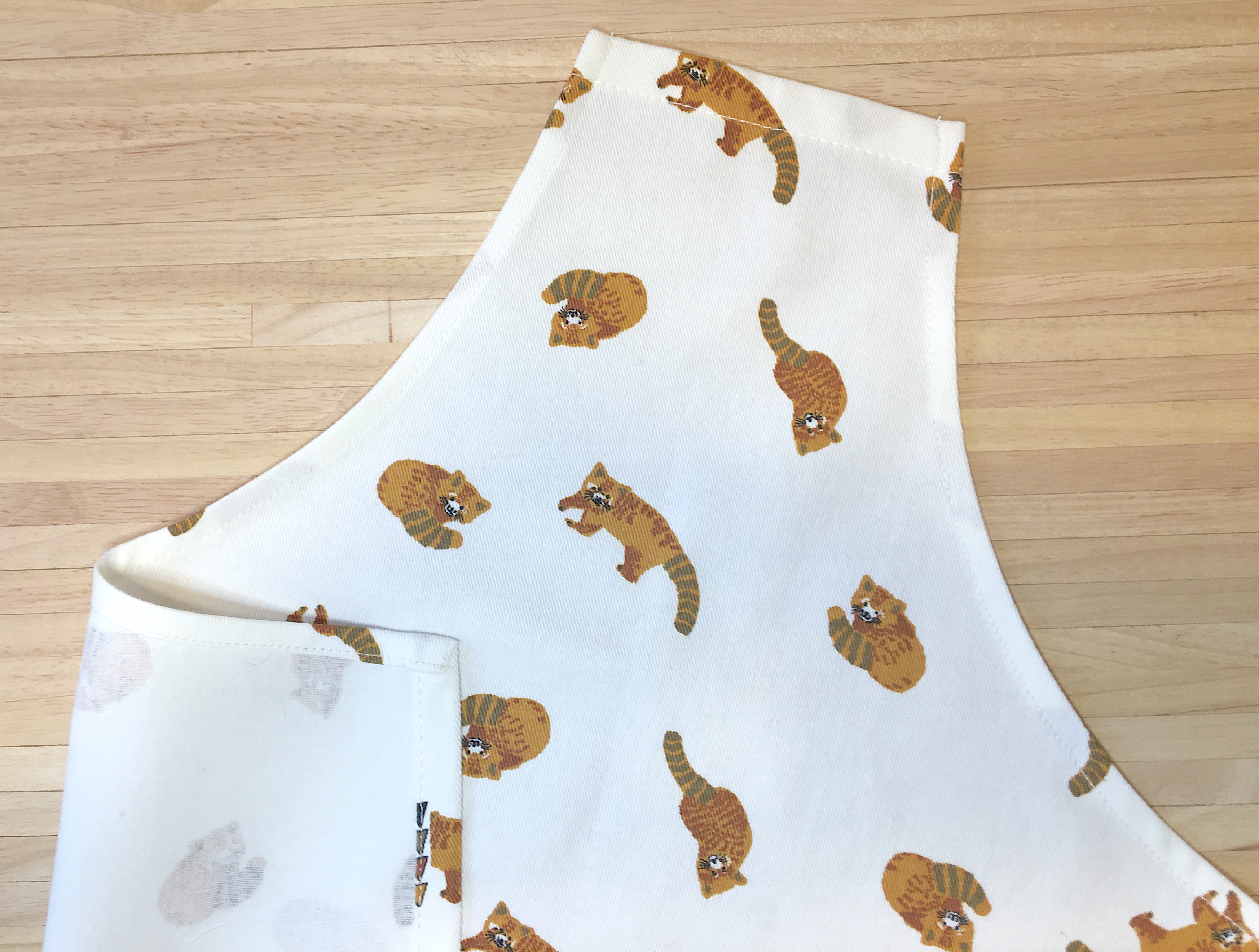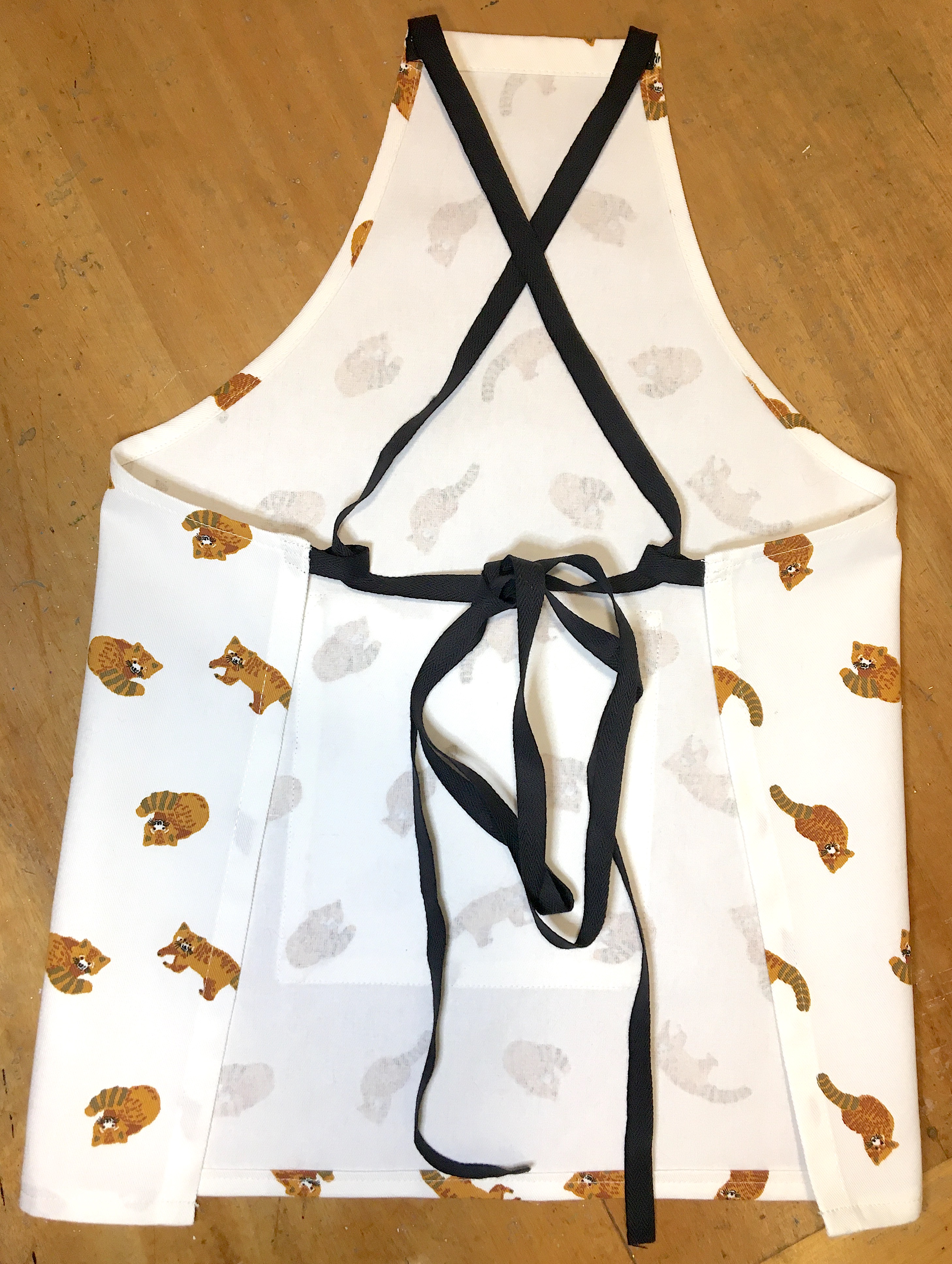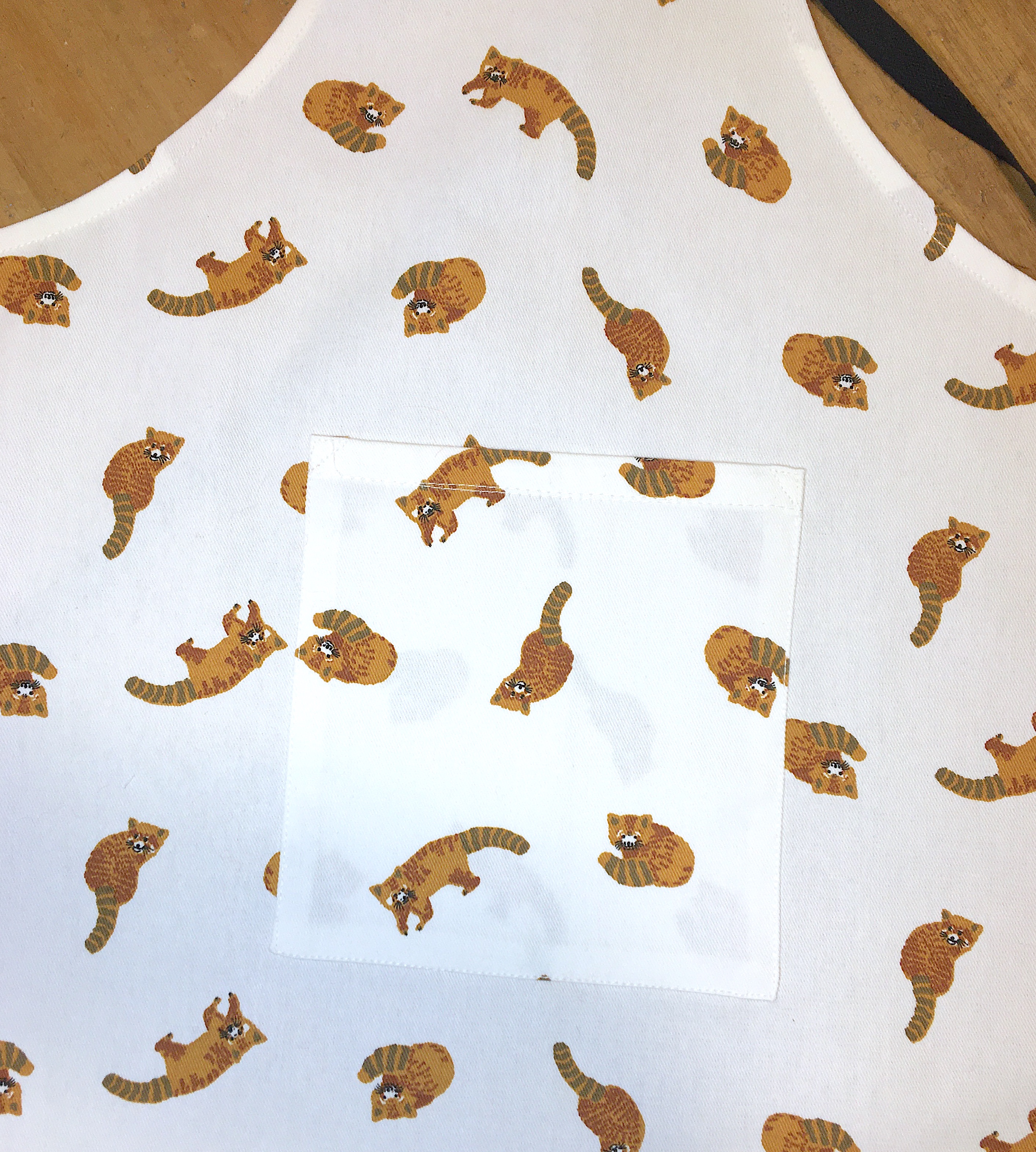 Préparer la poche. Couper un rectangle de 18 cm de large (2 cm pour les coutures) sur les 18 cm de hauteur qui correspondent à la bande coupée en bas du torchon. Surfiler sur les 3 côtés qui en ont besoin puis marquer au fer les rentrés. Utiliser l’ourlet du torchon pour le haut de la poche si l’imprimé le permet, ici cela a été possible pour les petits pandas roux mais pas pour les léopards. Centrer la poche à 9 cm du bas et la piquer sur le tablier.