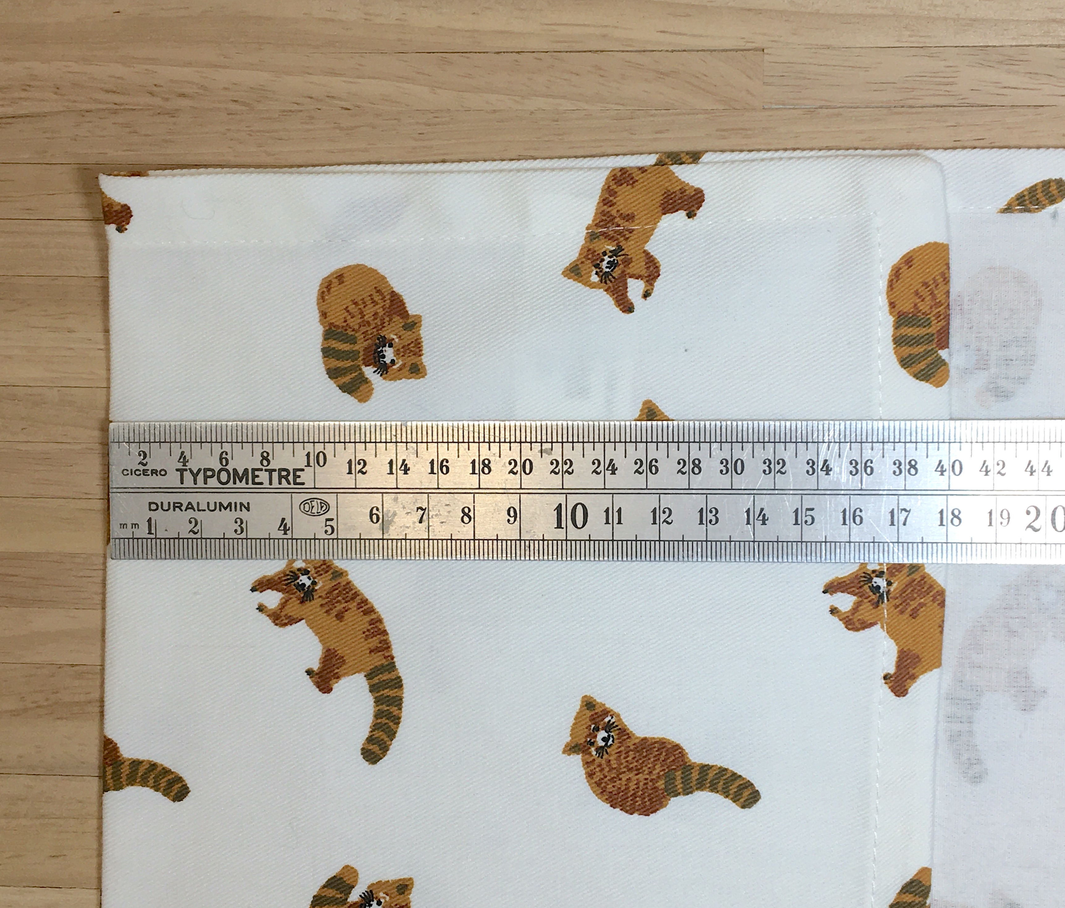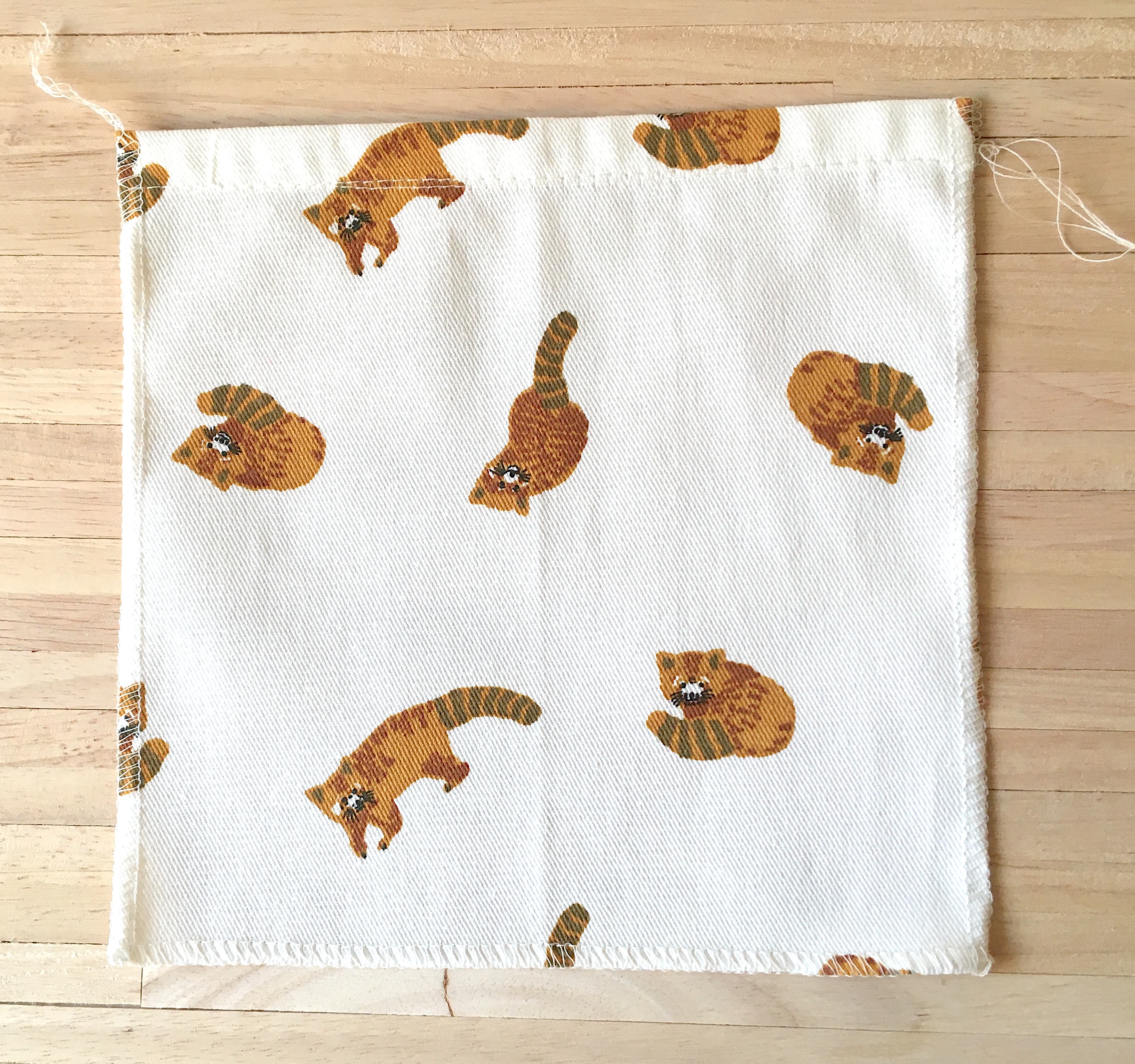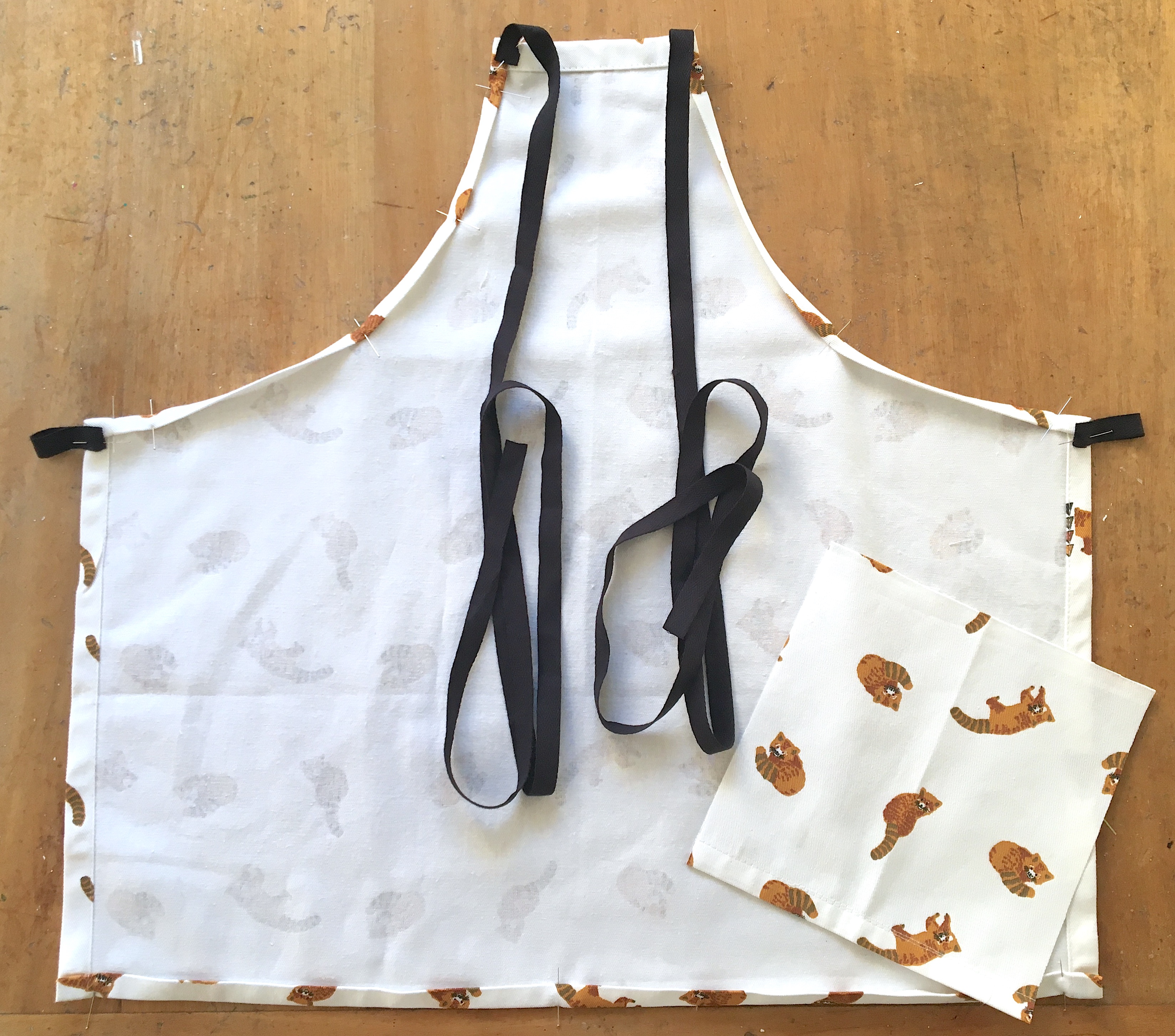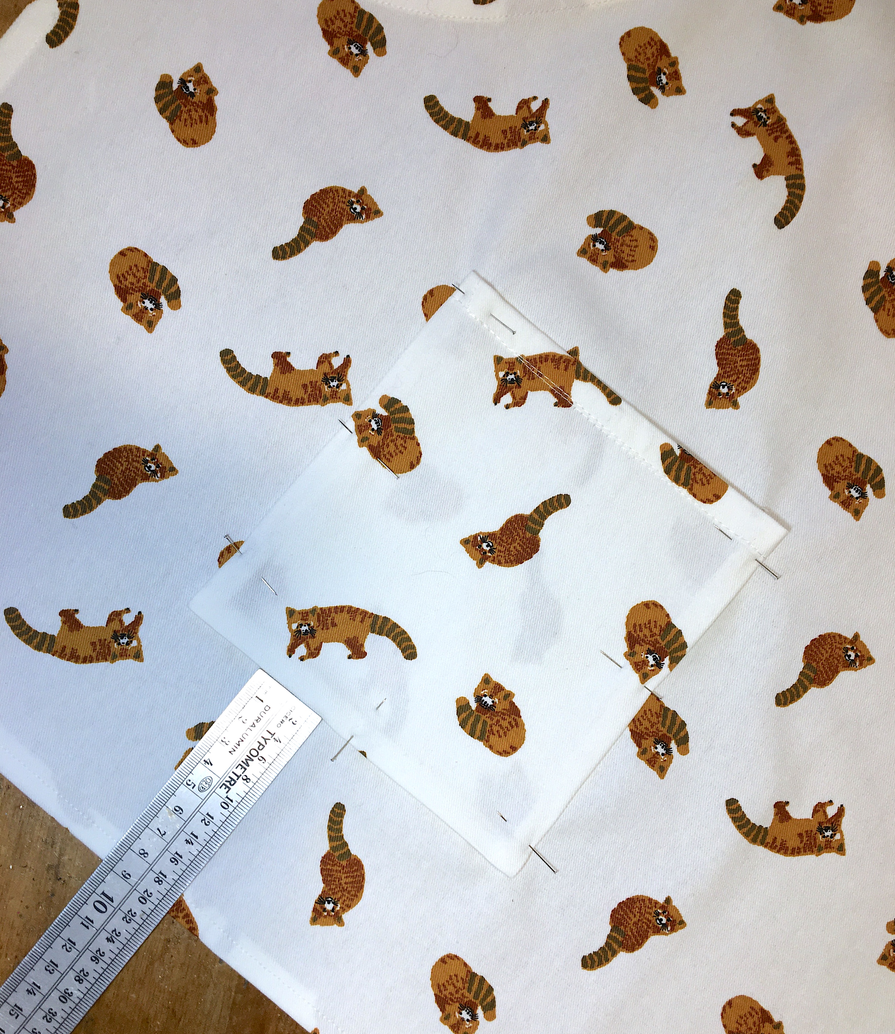 Préparer la poche. Couper un rectangle de 18 cm de large (2 cm pour les coutures) sur les 18 cm de hauteur qui correspondent à la bande coupée en bas du torchon. Surfiler sur les 3 côtés qui en ont besoin puis marquer au fer les rentrés. Utiliser l’ourlet du torchon pour le haut de la poche si l’imprimé le permet, ici cela a été possible pour les petits pandas roux mais pas pour les léopards. Centrer la poche à 9 cm du bas et la piquer sur le tablier.