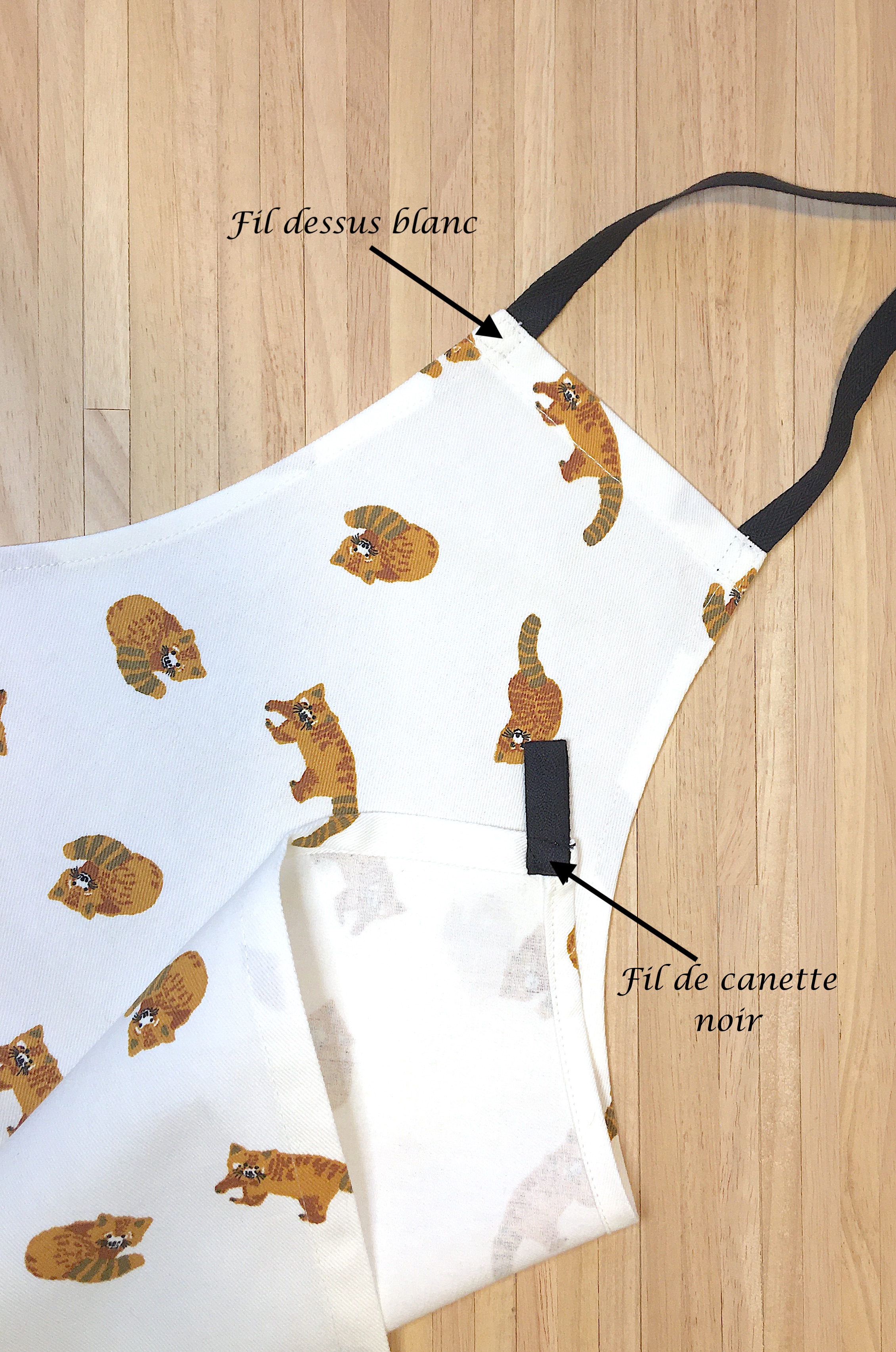 Une astuce pour coudre des liens noirs sur un tissu blanc, mettre un fil noir dans la cannette et un blanc pour le fil de dessus.