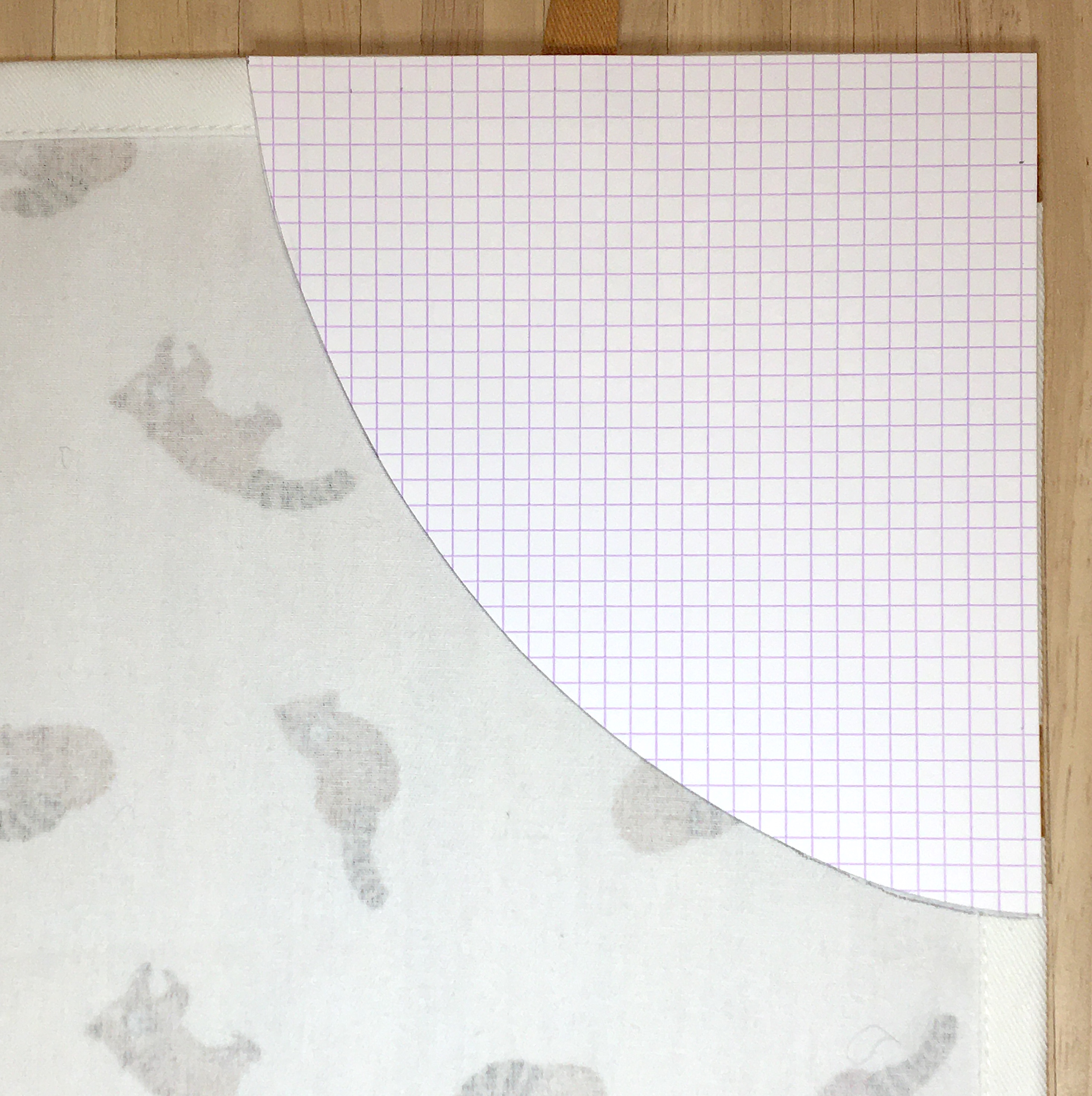 Couper ensuite dans les angles les arrondis en vous aidant du patron. La forme du tablier apparaît. On peut adapter la l’échancrure du dessous de bras en s’aidant d’un teeshirt pour représenter le buste de l’enfant.
