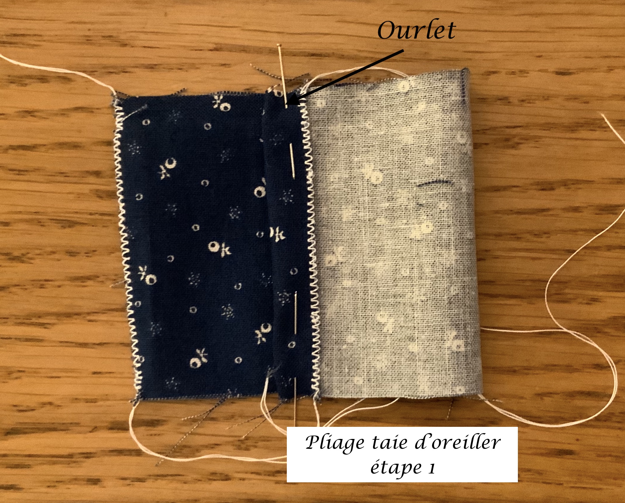 Prendre les mesures pour faire une taie comportant un revers à l’intérieur qui a pour fonction de maintenir l’oreiller en place. Découper le rectangle, surfiler les petits côtés. Plier la taie puis piquer les 2 côtés.