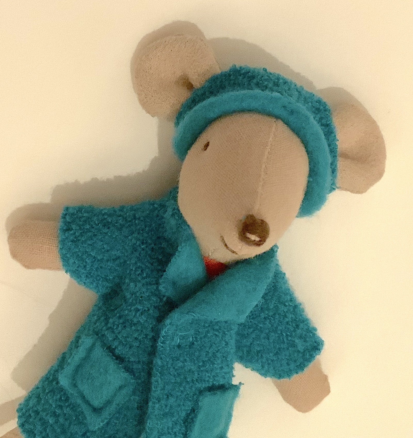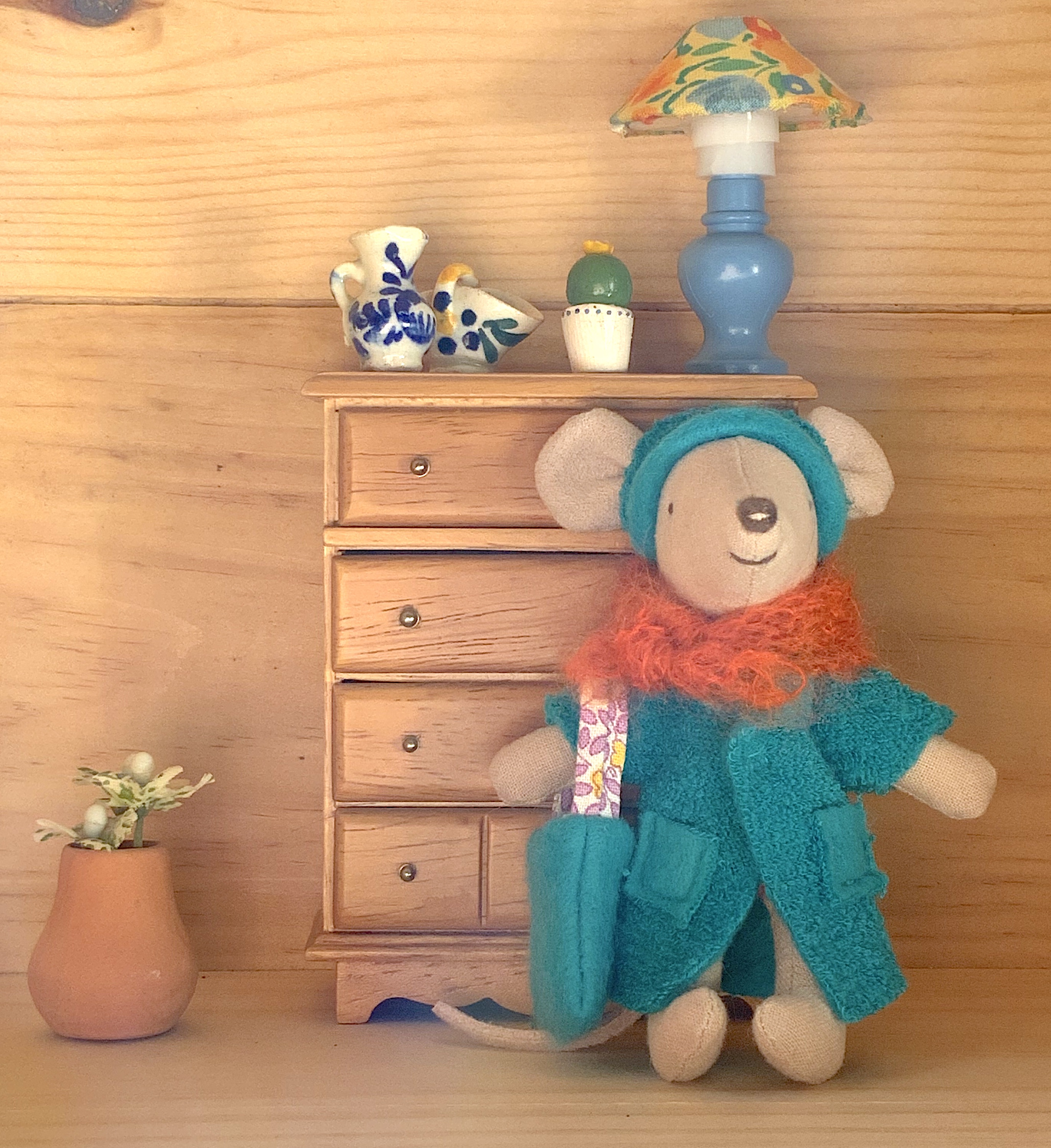 Même si les jours rallongent et que la végétation semble reprendre vie, s’équiper chaudement reste nécessaire en ce mois de février. Petite Sœur, de la famille des souris Maileg a ainsi revêtu son beau manteau bleu et son bonnet assorti. Un petit tote bag vient compléter la tenue.