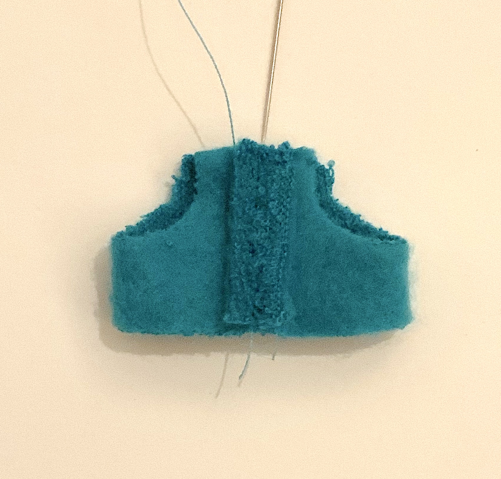Faire les coutures des épaules et des côtés, à la machine ou à la main. Comme le tissu est double face, choisir au préalable le côté qui sera l’endroit. Ici le côté bouclette. Cranter les dessous de bras.