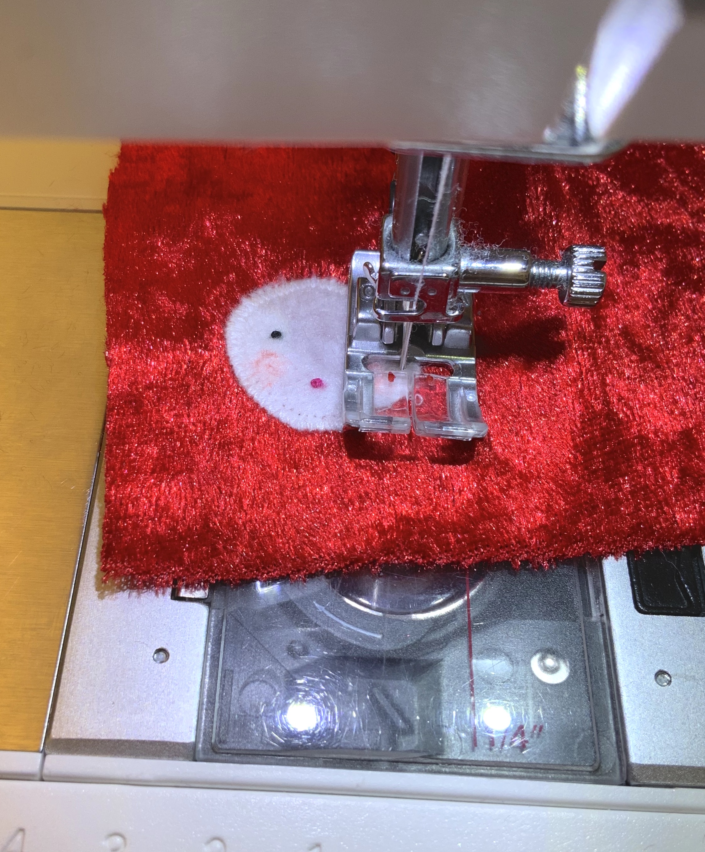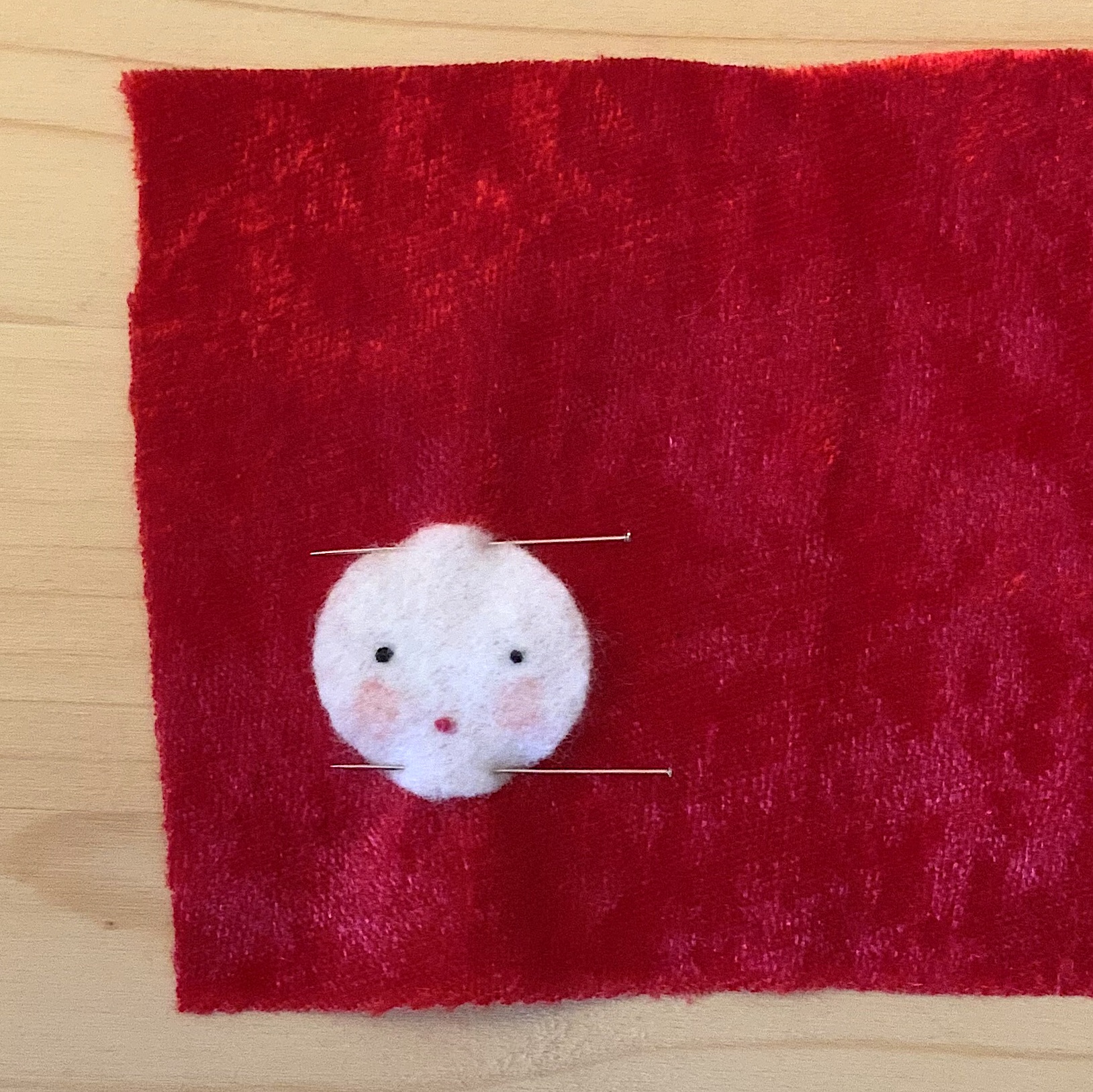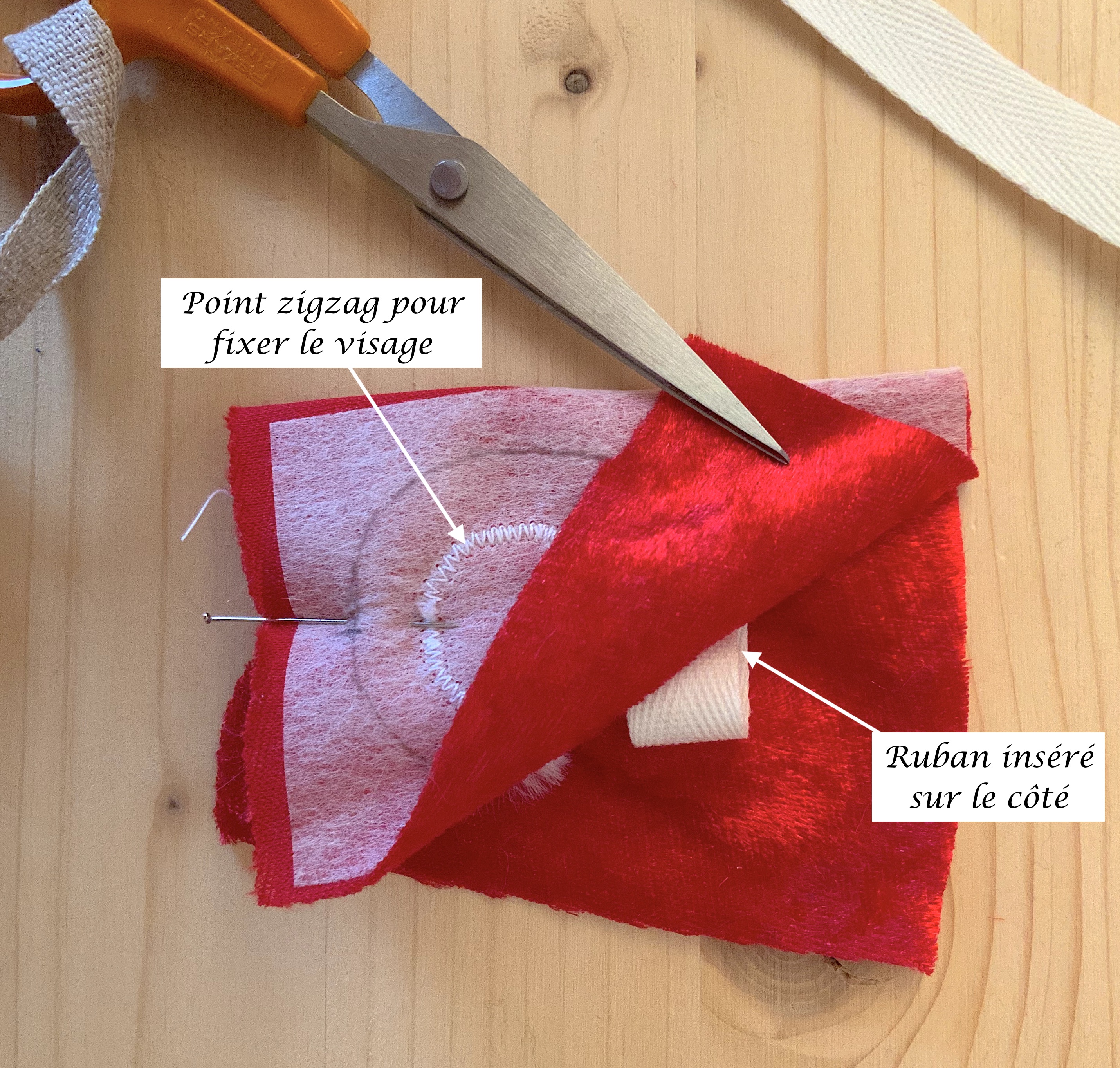 Réaliser le visage en découpant un cercle dans la feutrine blanche. Avec du fil à broder noir faire 2 point de noeud pour les yeux et avec du rose faire la bouche. Avec un feutre rose en effleurant la feutrine faire les joues. Prendre repères pour bien positionner le visage sur la feutrine rouge, envers de la feutrine sur l’endroit du velours. Maintenir par une piqûre au point zigzag tout autour.