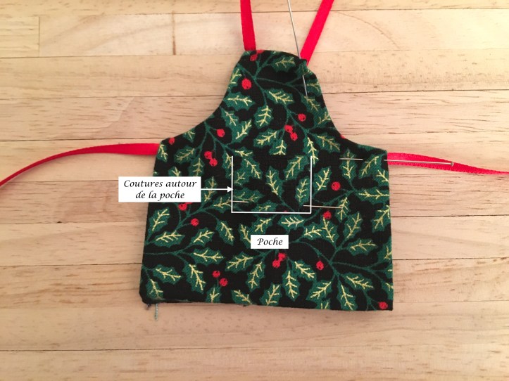 Avec le fer à repasser marquer un rentré de 0,5 cm tout autour. Placer la poche au milieu. Placer les liens pour le tour du cou et les côtés. Faire la couture autour de la poche sur 3 côtés puis piquer le rentré tout autour du tablier en prenant les liens dans la couture.