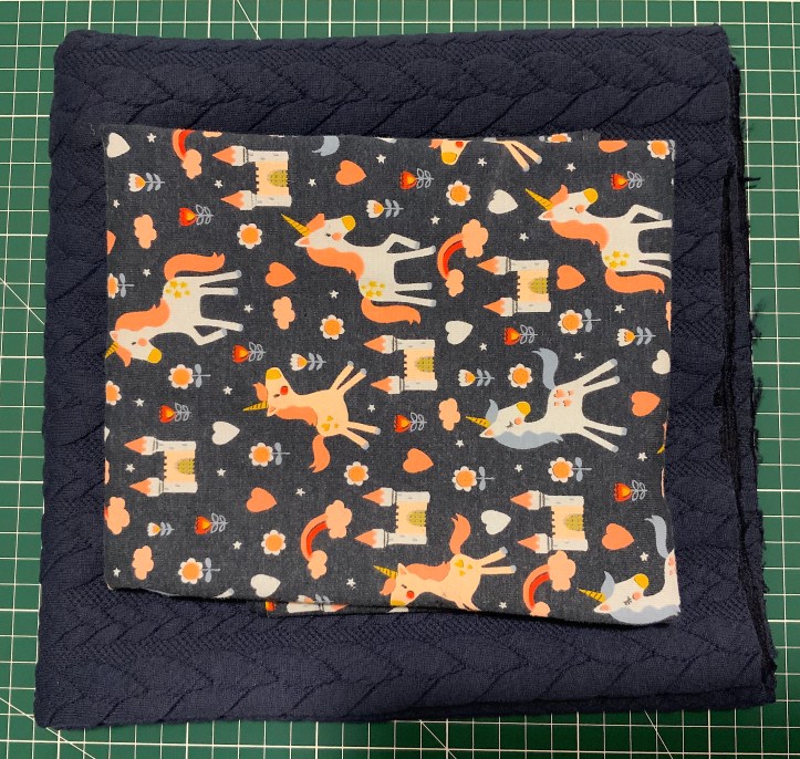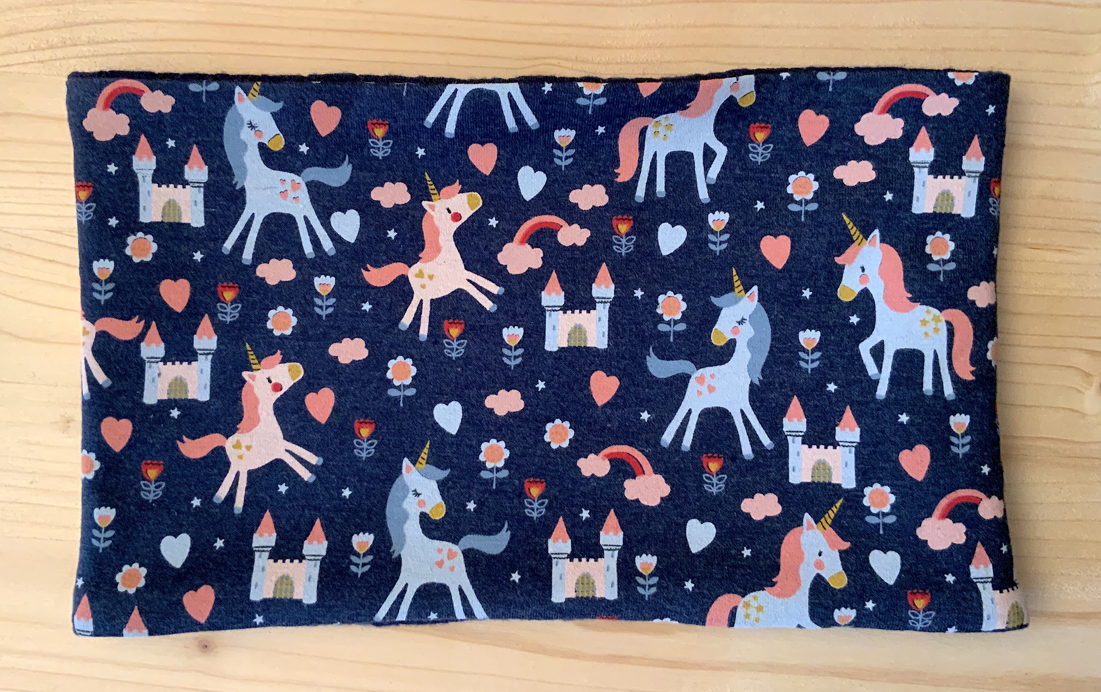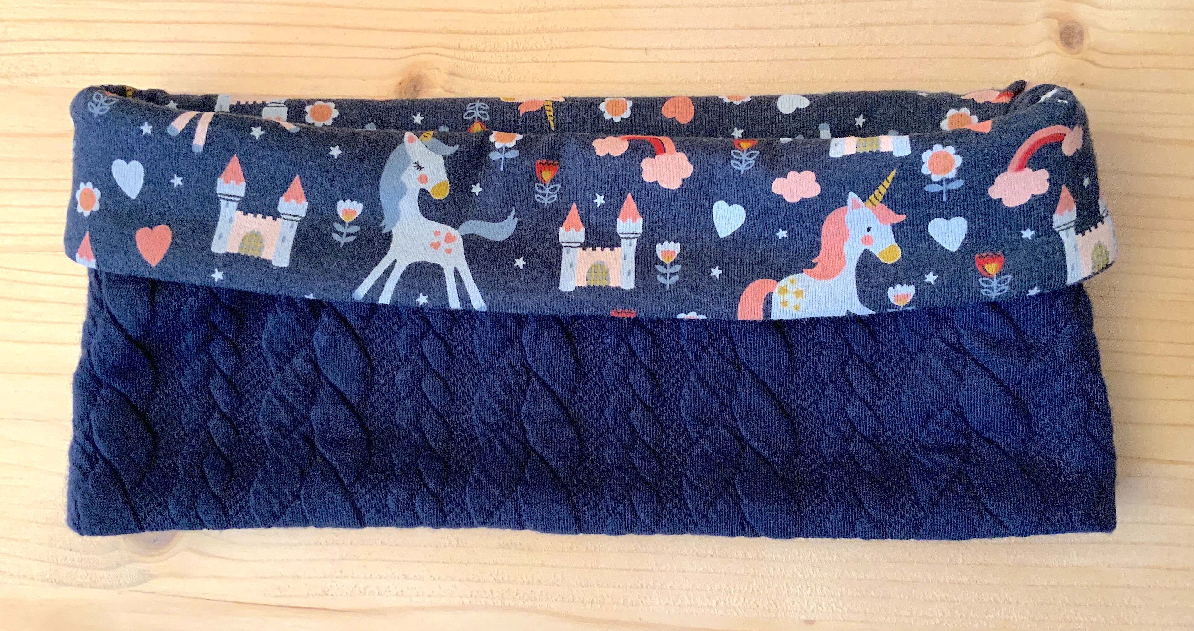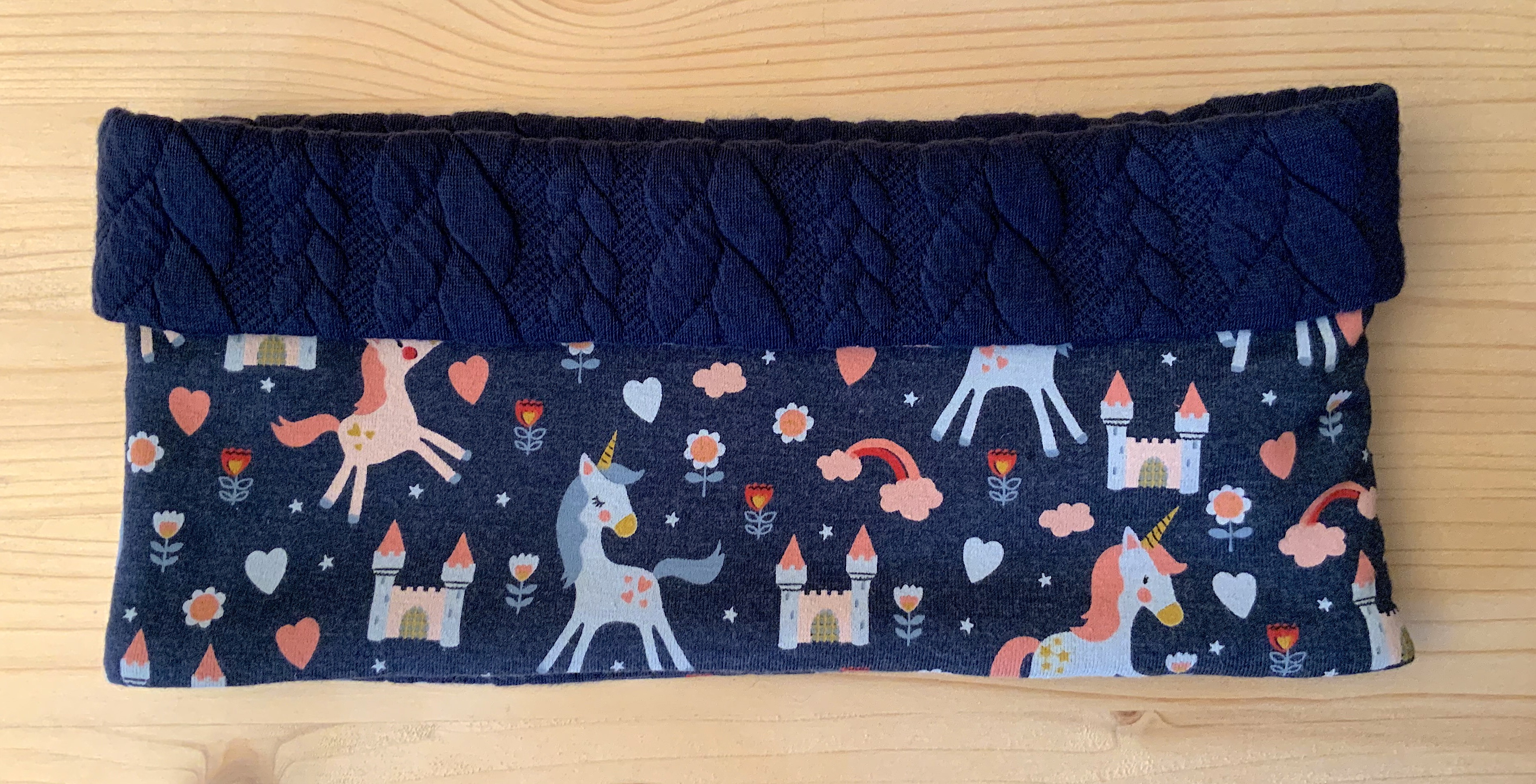 • Deux tissus de jersey. On peut choisir parmi les fausses fourrures, les microfibres, les velours… On peut prendre deux tissus différents pour en faire un snood réversible. Dans le modèle enfant présenté ici il y a un tissu bleu marine type sweat/molleton à motifs torsades et un jersey de coton à motifs licornes.