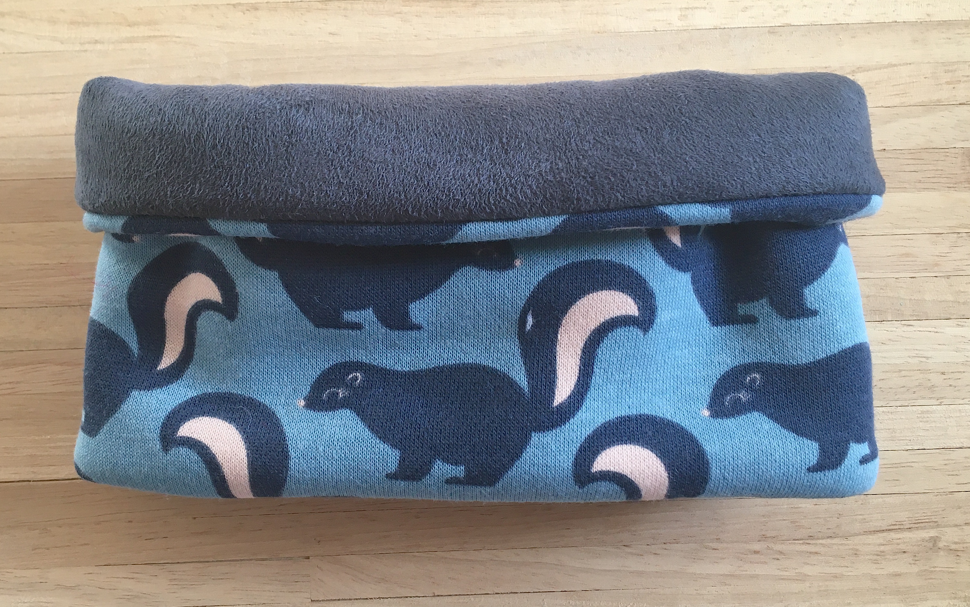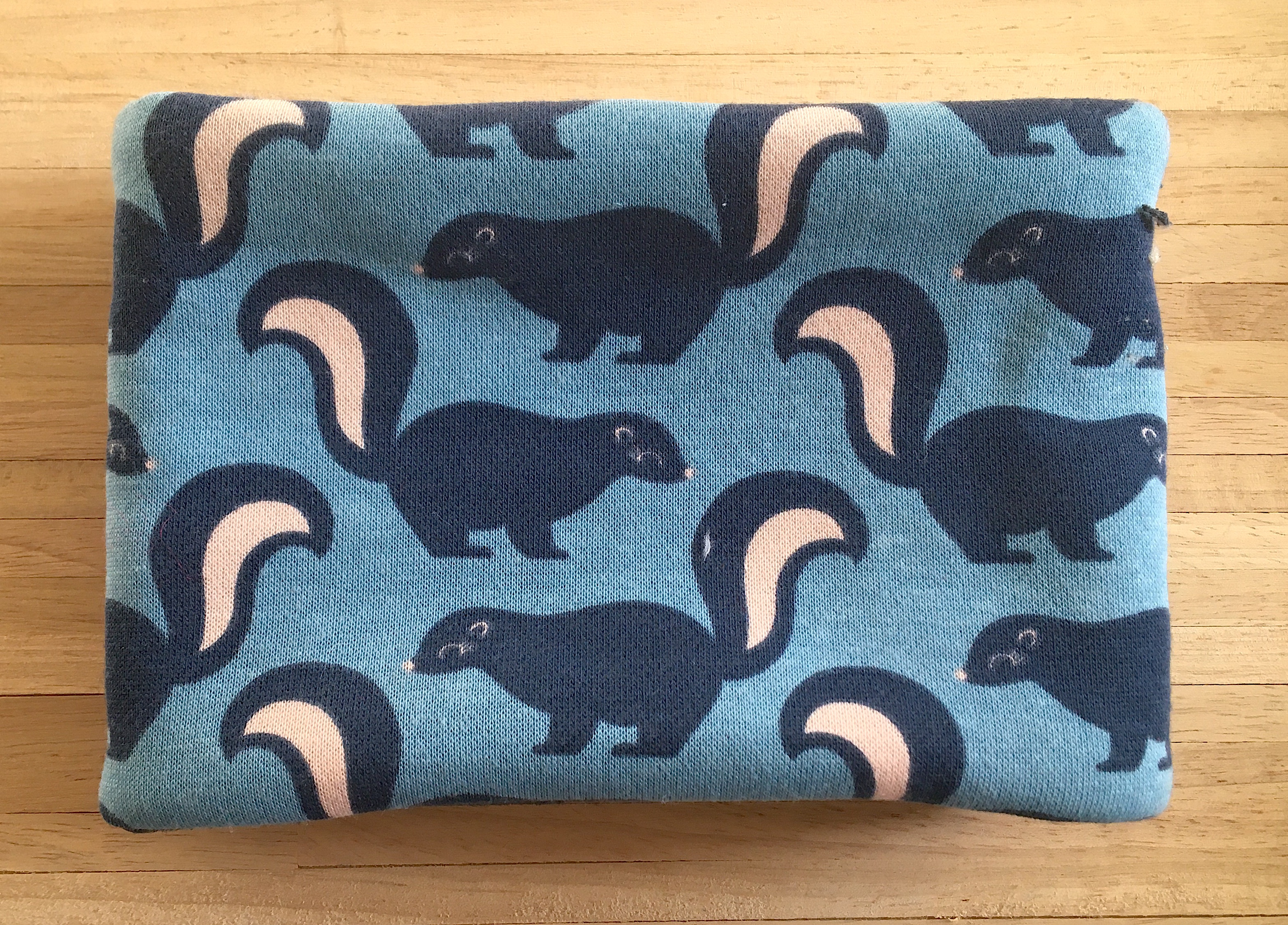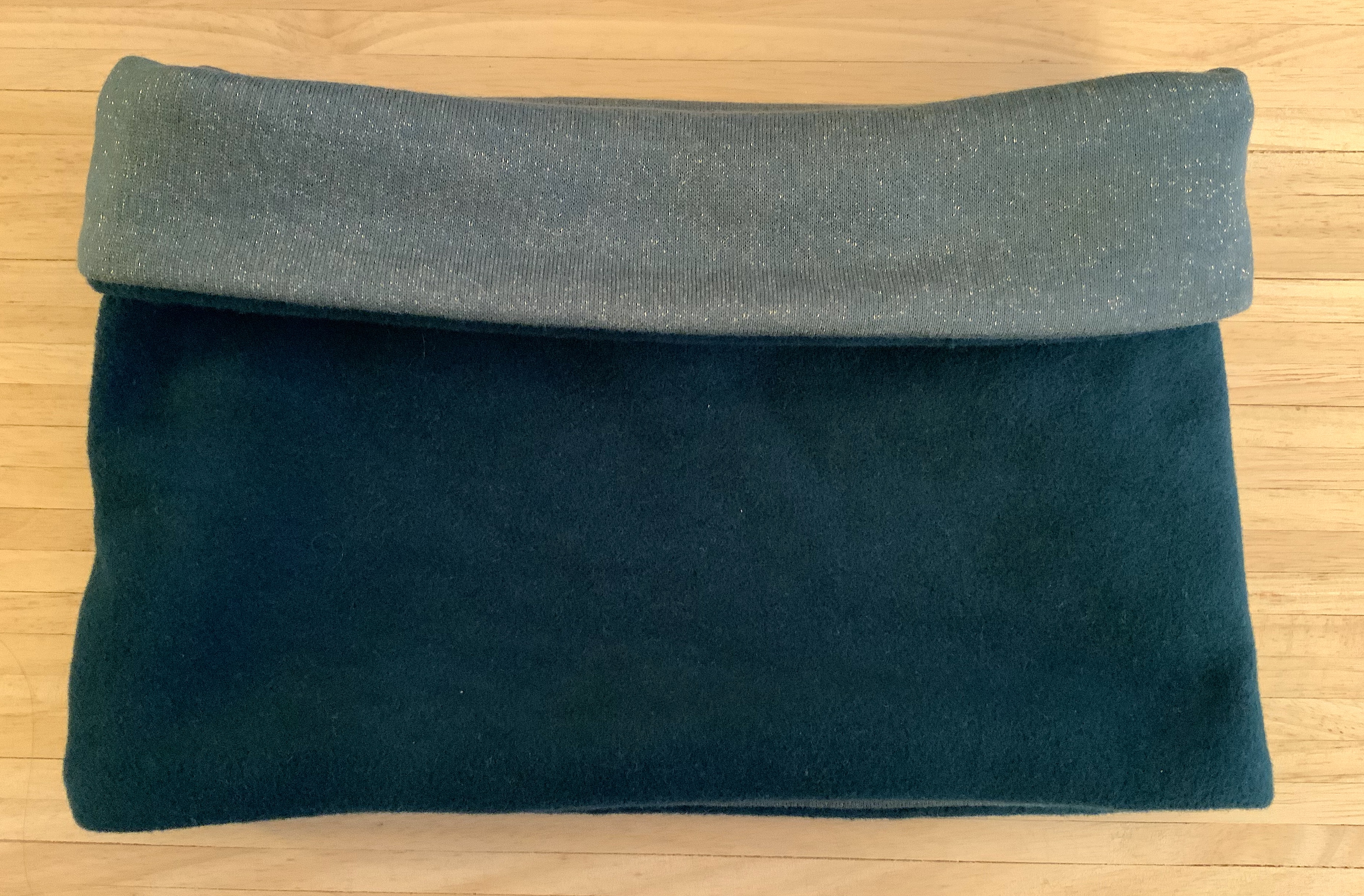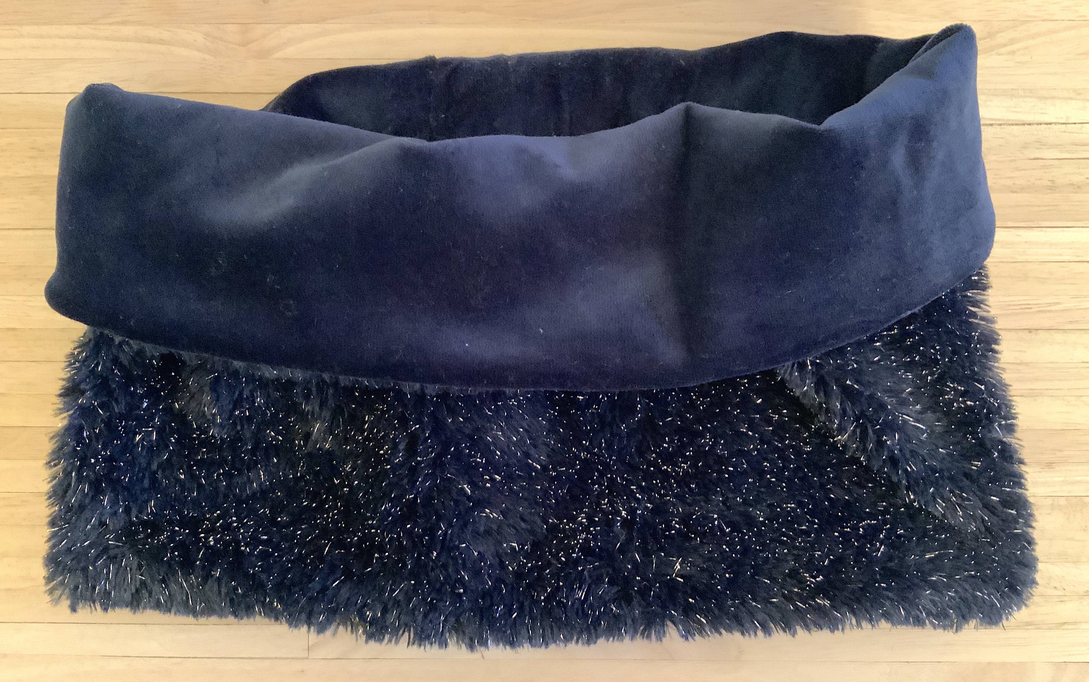 • Deux tissus de jersey. On peut choisir parmi les fausses fourrures, les microfibres, les velours… On peut prendre deux tissus différents pour en faire un snood réversible. Dans le modèle enfant présenté ici il y a un tissu bleu marine type sweat/molleton à motifs torsades et un jersey de coton à motifs licornes.