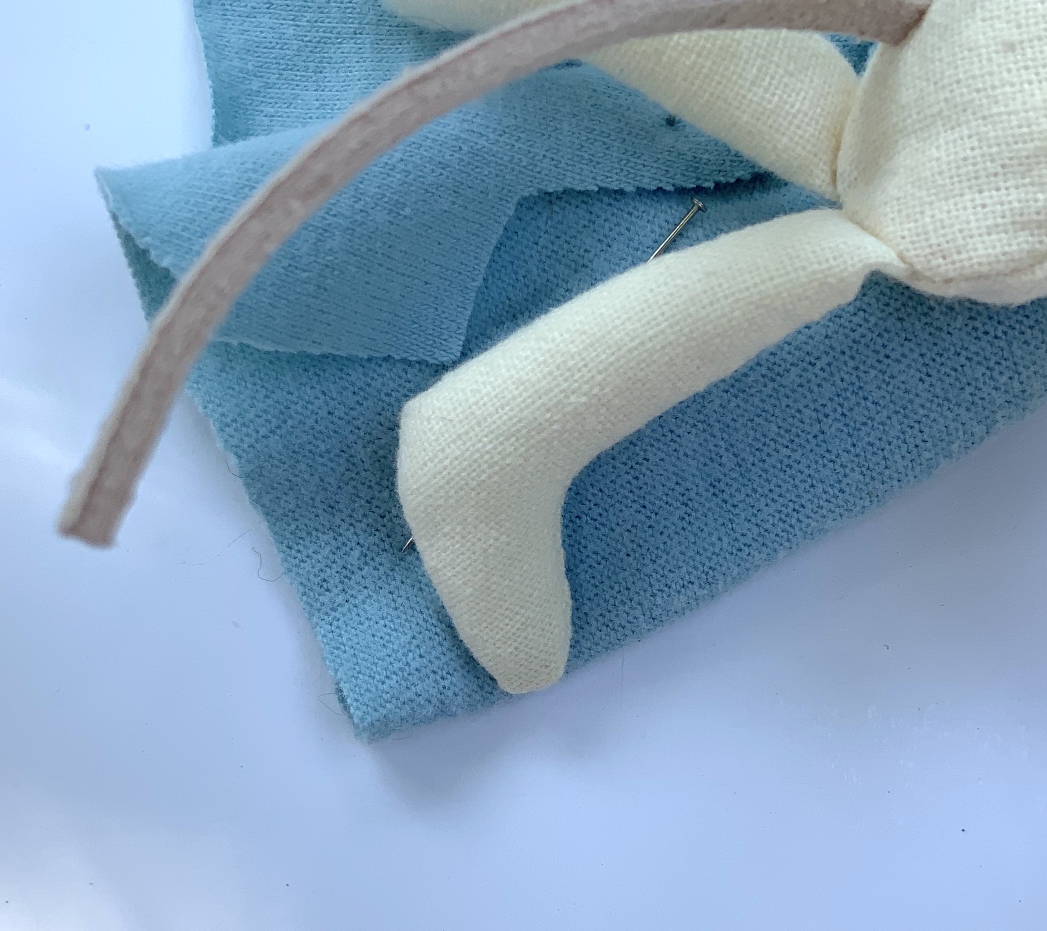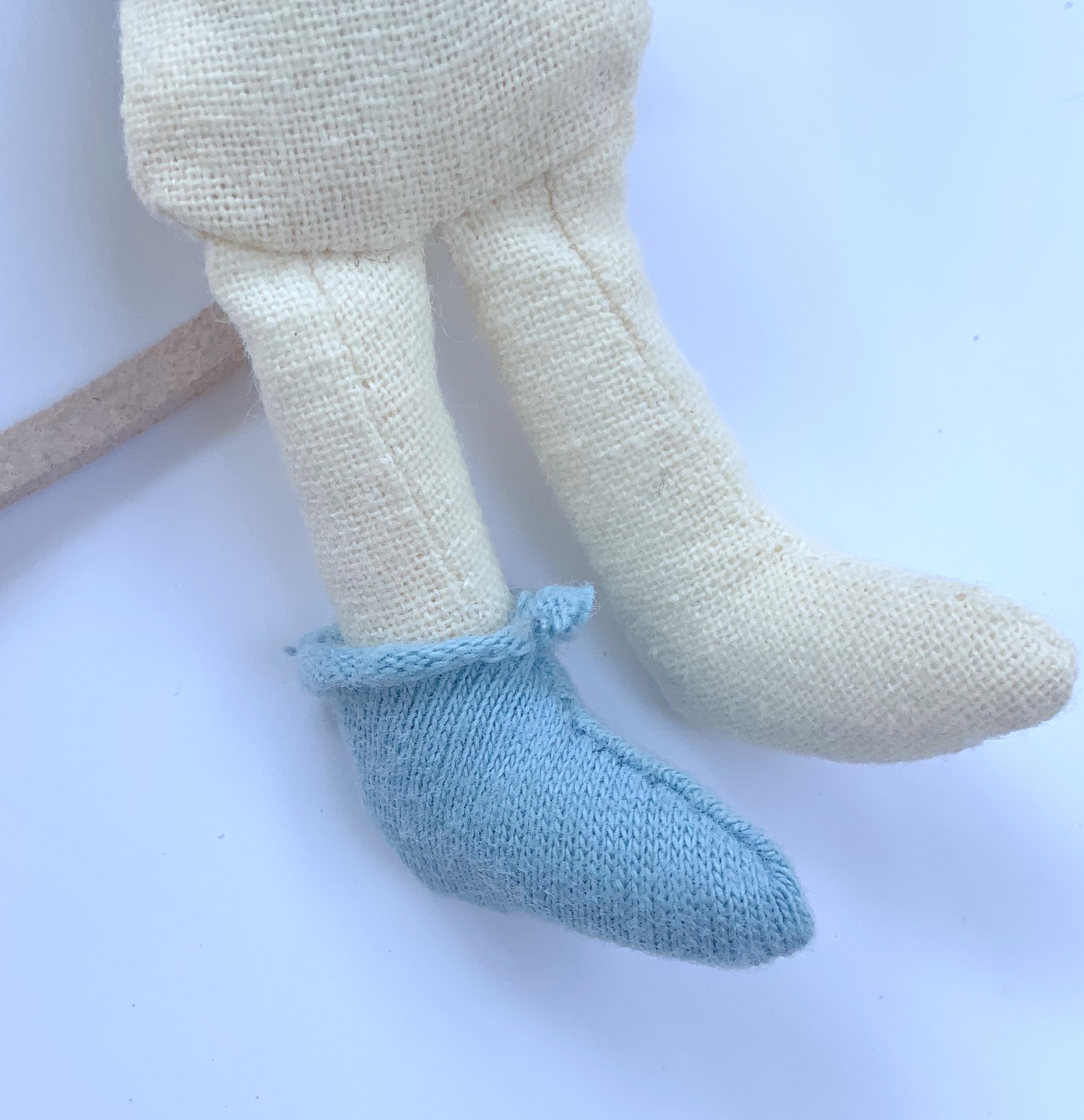 Faire les chaussons. Commencer par prendre les empreintes des pieds, dessiner le contour sur le tissu plié en 2, coudre à la main, découper, retourner et enfiler sur les pieds de la souris.